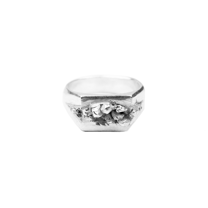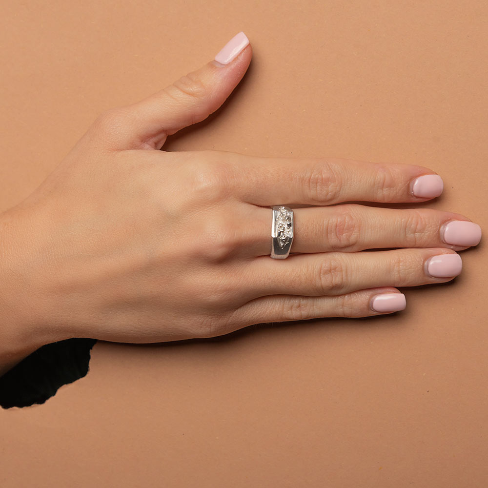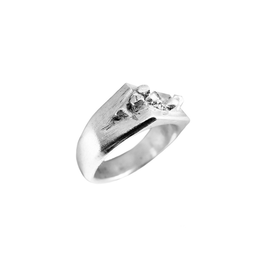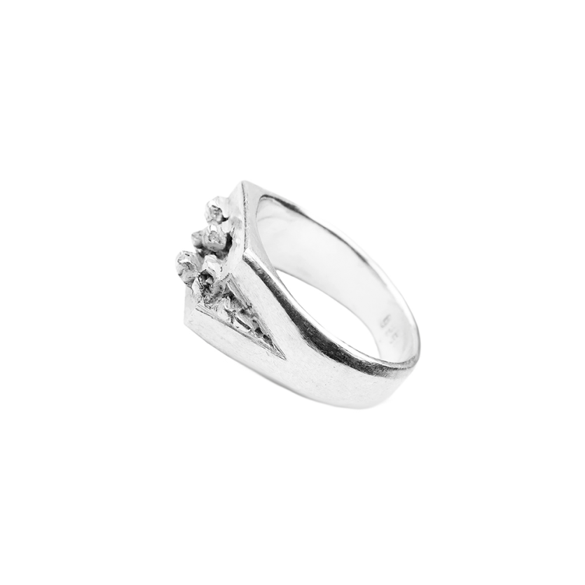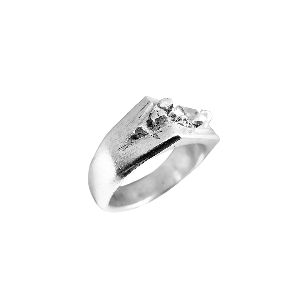 Prstan s čudovitim detajlom kristalov, ki se preraščajo iz sredinske razpoke in ustvarjajo kontrast strogi obliki pečatnika.