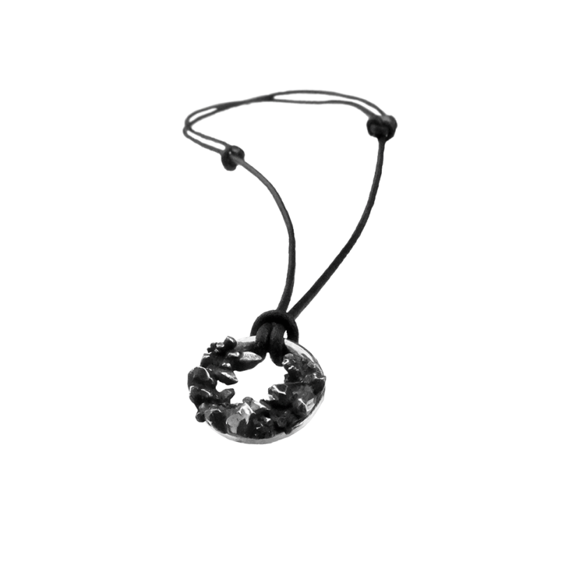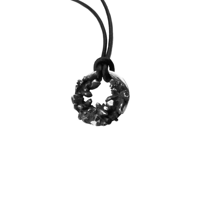 Srebrn obesek krožne oblike na usnjeni vrvici nastavljive dolžine. Kristali se razraščajo iz notranjosti in ustvarjajo kontrast med gladko geometrijsko formo kroga in organsko rastjo kristalov.