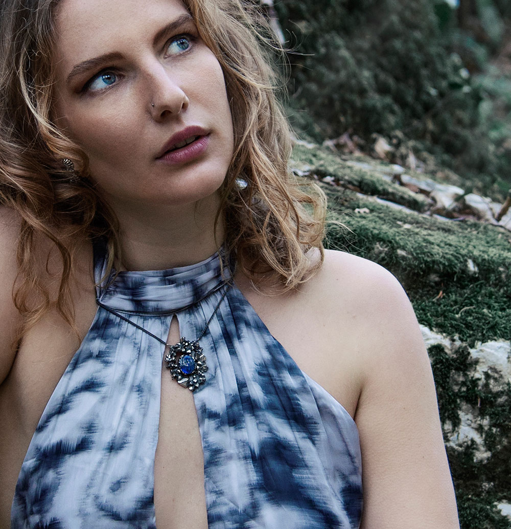 Osrednji elementi kolekcije 'Čisti kristal' so iskrive kristalne strukture, ki na videz delujejo, kot da so v simbiozi s človeškim telesom. Geometrijski kristali s svojimi ravnimi linijami in organsko rastjo ustvarjajo dinamično igro kontrastov; med grobim in nežnim, med organskim in geometrijskim. Oblike kristalov dopolnjujejo prosojni dragulji, ki poudarjajo njihov lesk in teksturo. Kolekcija je namenjena odločnim posameznikom z izostrenim občutkom za estetiko, ki ljubijo čiste linije v kontrastu z neukročeno naravo.
