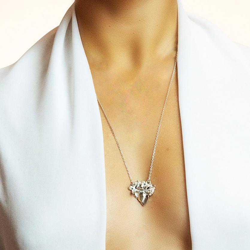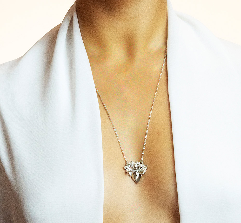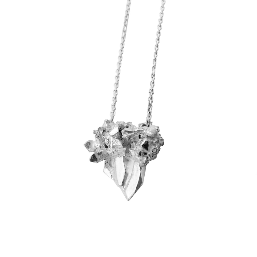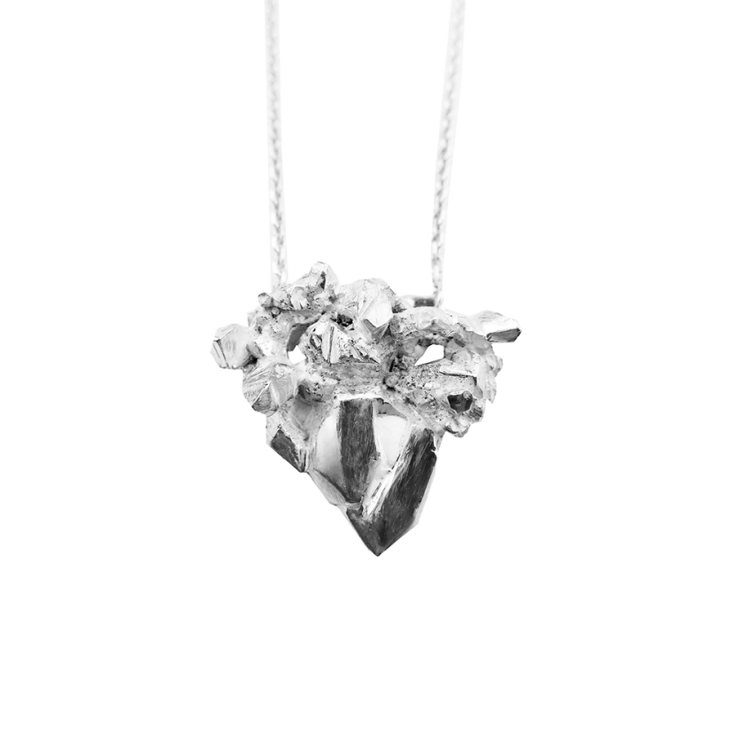 Anatomska oblika človeškega srca kristalizirana v čudovit srebrn obesek s strukturo kristalov kamene strele.