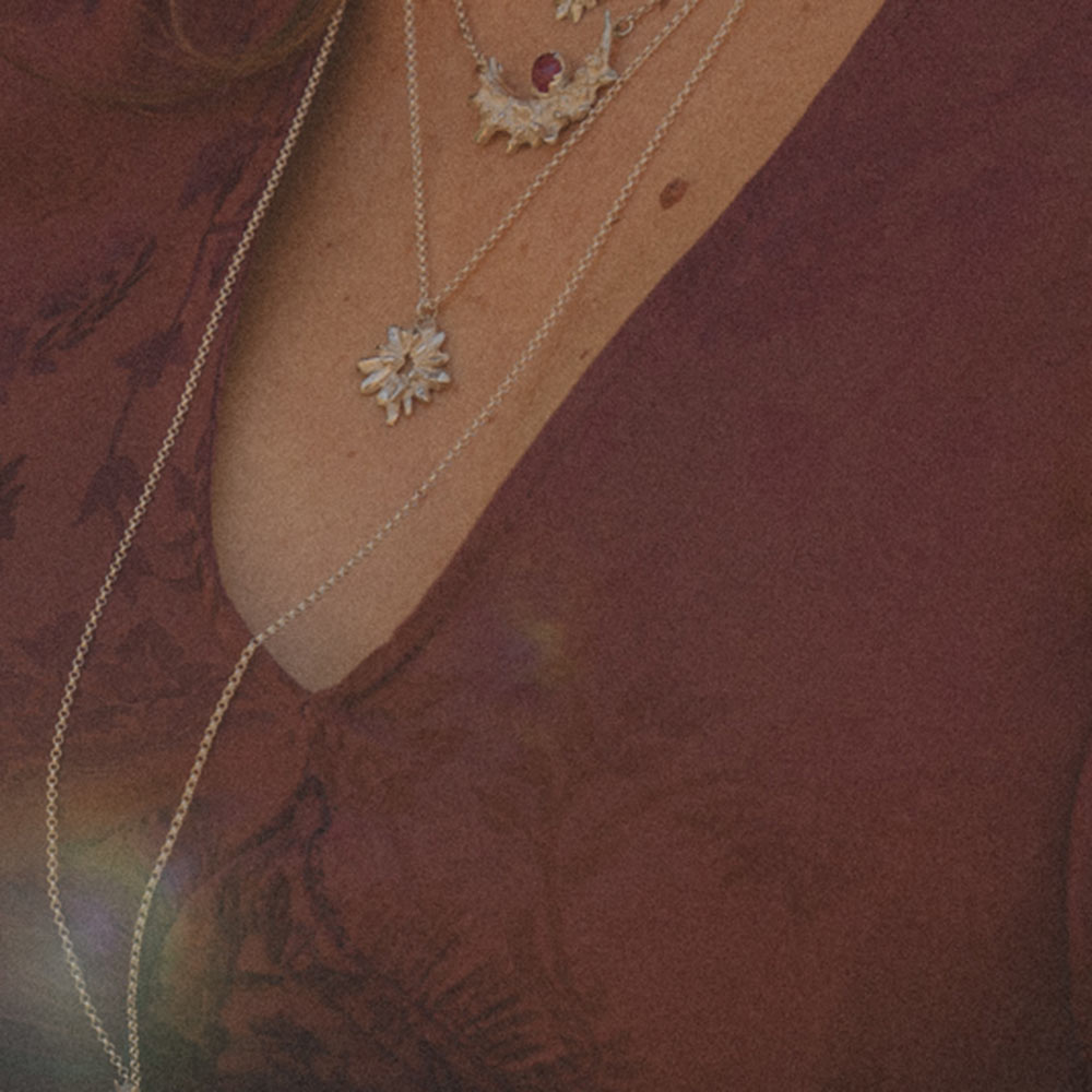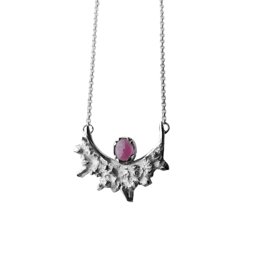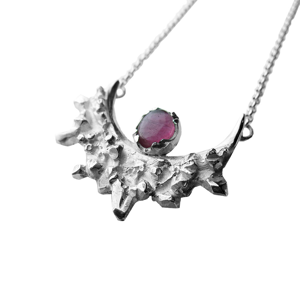 Elegantna srebrna, ki ujame magijo mističnost nočnega neba. Osrednji motiv je lunin krajec, posut s sijočimi kristali, ki ustvarjajo čarobno igro svetlobe. V središču forme kraljuje čudovit kabošon rubin, simbol strasti, vitalnosti in ljubezni. Ogrlica je popolna izbira za vse, ki želijo nositi pridih elegance z mističnim pridihom. Čudovito se poda tudi k kombinacijam z ogrlicami različnih dolžin, kar omogoča popolnoma unikatno plastenje nakita.