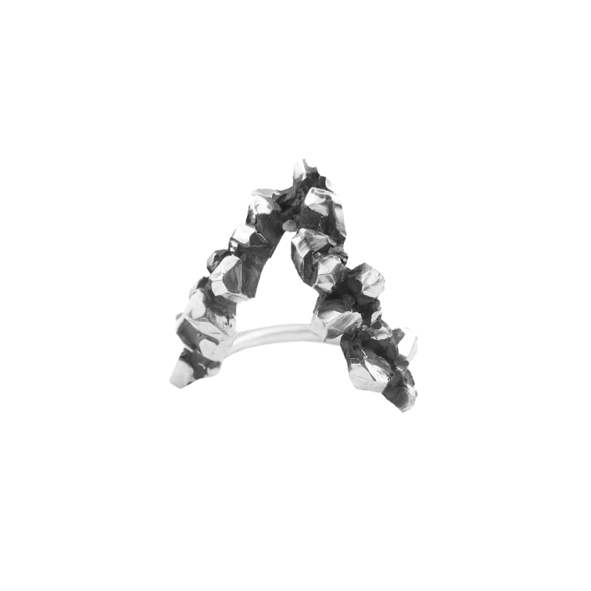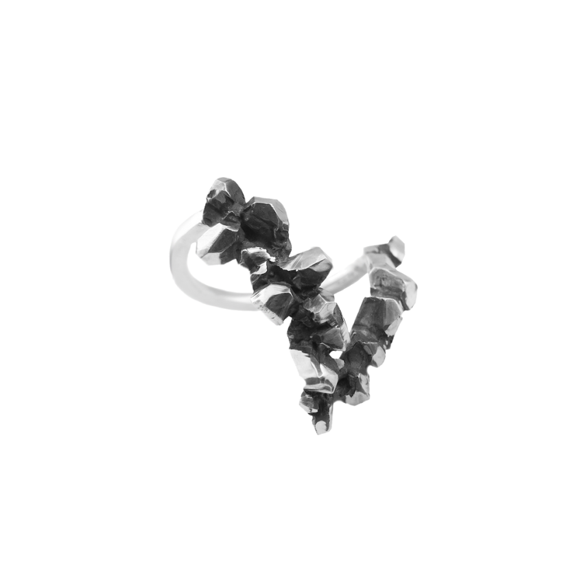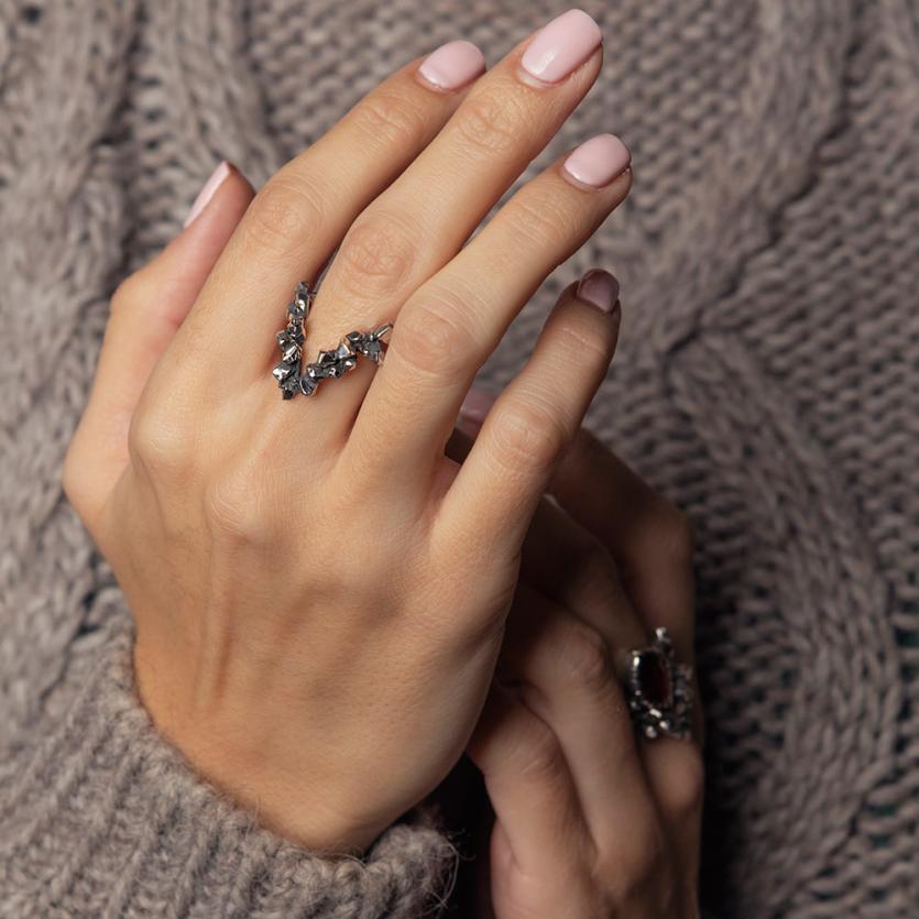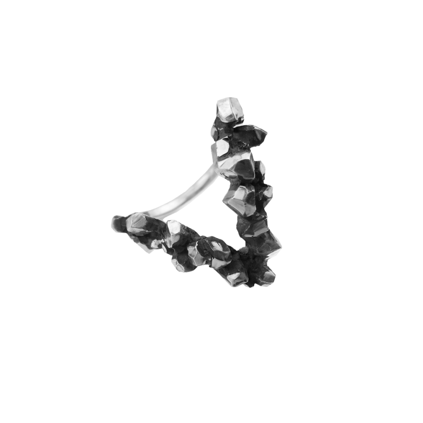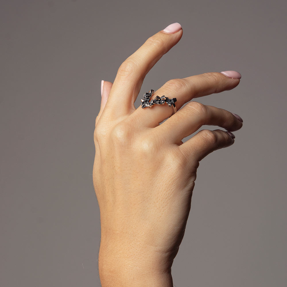 Eleganten prstan s kontrastom med geometrijsko obliko trikotnika in organsko strukturo kristalov v oksidiranem srebru.