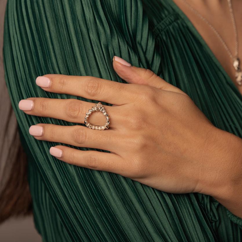 Zasijte z dramatičnim prstanom v obliki sončnega oboda, ki ga sestavljajo žarkasto razporejeni kristali.