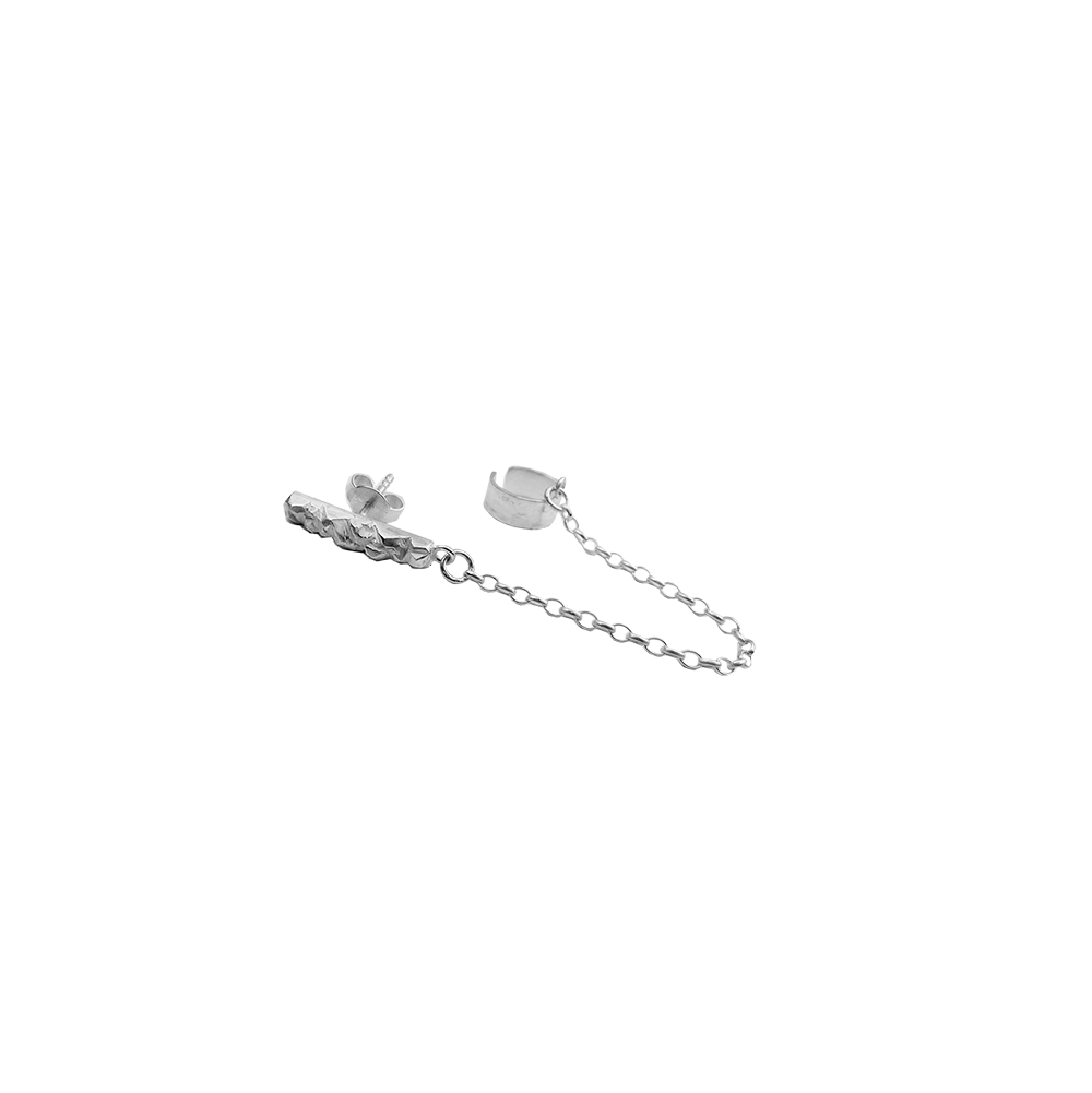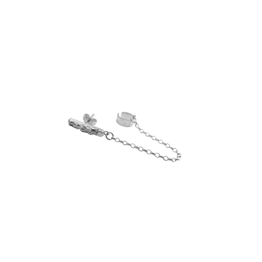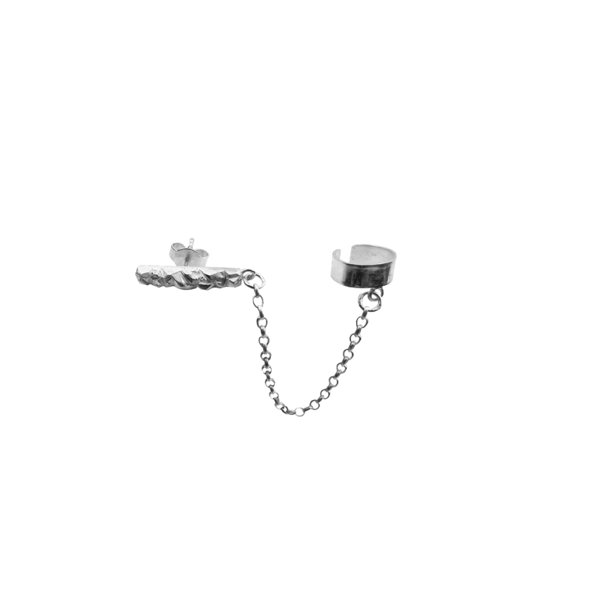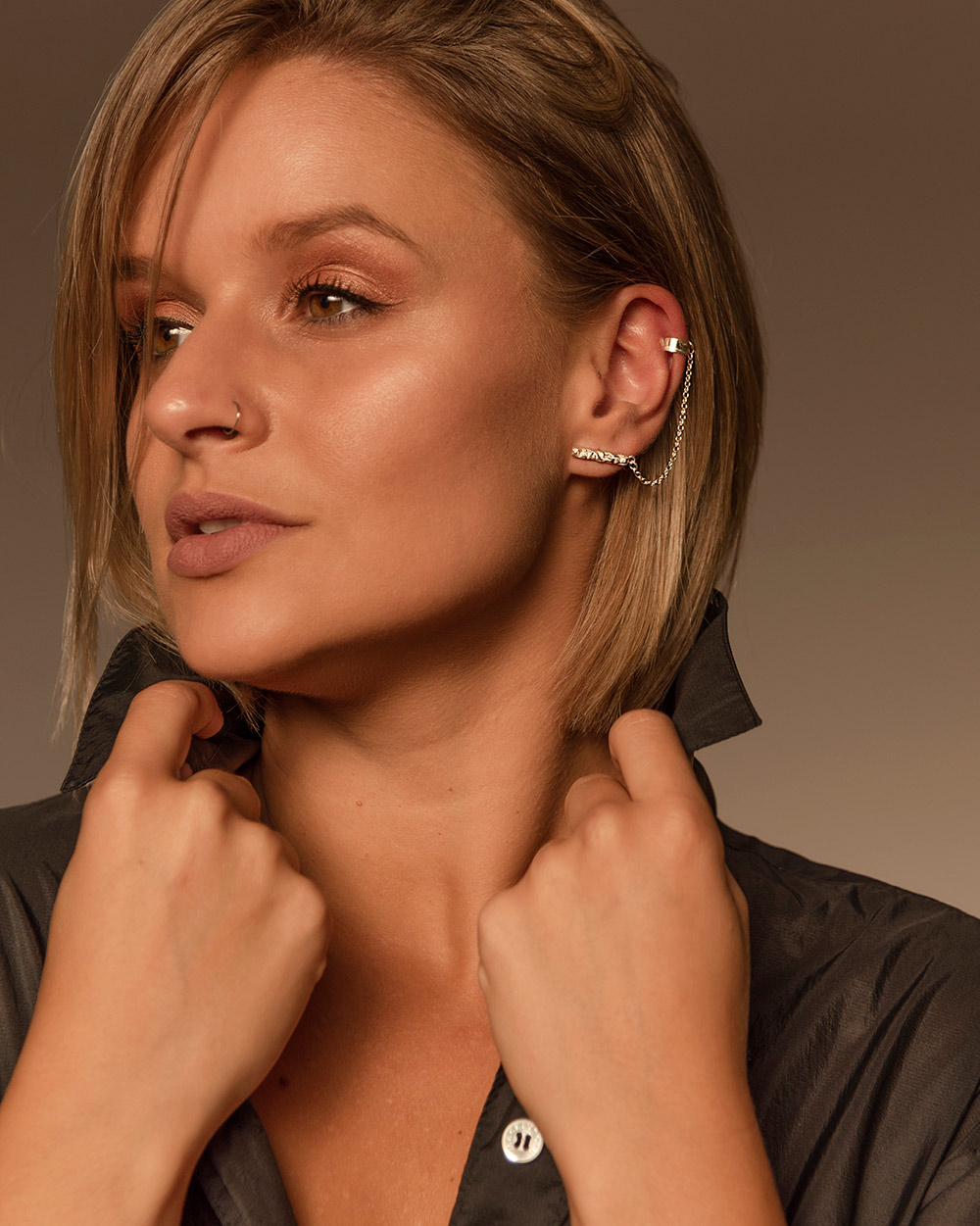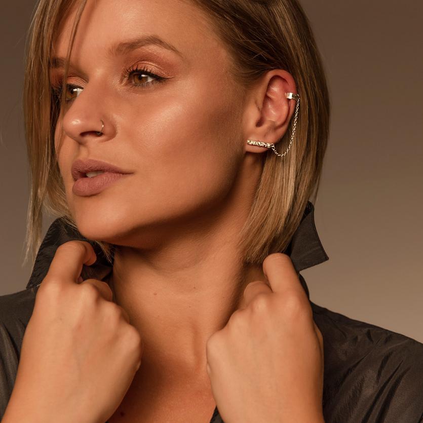 Drzen uhan z minimalistično kristalno strukturo ustvarja iluzijo, da imate dvakrat prebodeno uho. Prvi del uhana se vpne klasično, drugi del, ki je povezan z verižico, pa se z obročkom pripne na zgornji rob ušesa.