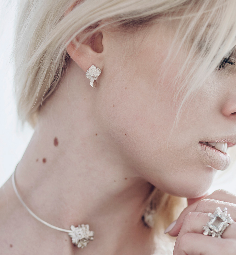 Osrednji elementi kolekcije 'Čisti kristal' so iskrive kristalne strukture, ki na videz delujejo, kot da so v simbiozi s človeškim telesom. Geometrijski kristali s svojimi ravnimi linijami in organsko rastjo ustvarjajo dinamično igro kontrastov; med grobim in nežnim, med organskim in geometrijskim. Oblike kristalov dopolnjujejo prosojni dragulji, ki poudarjajo njihov lesk in teksturo. Kolekcija je namenjena odločnim posameznikom z izostrenim občutkom za estetiko, ki ljubijo čiste linije v kontrastu z neukročeno naravo.