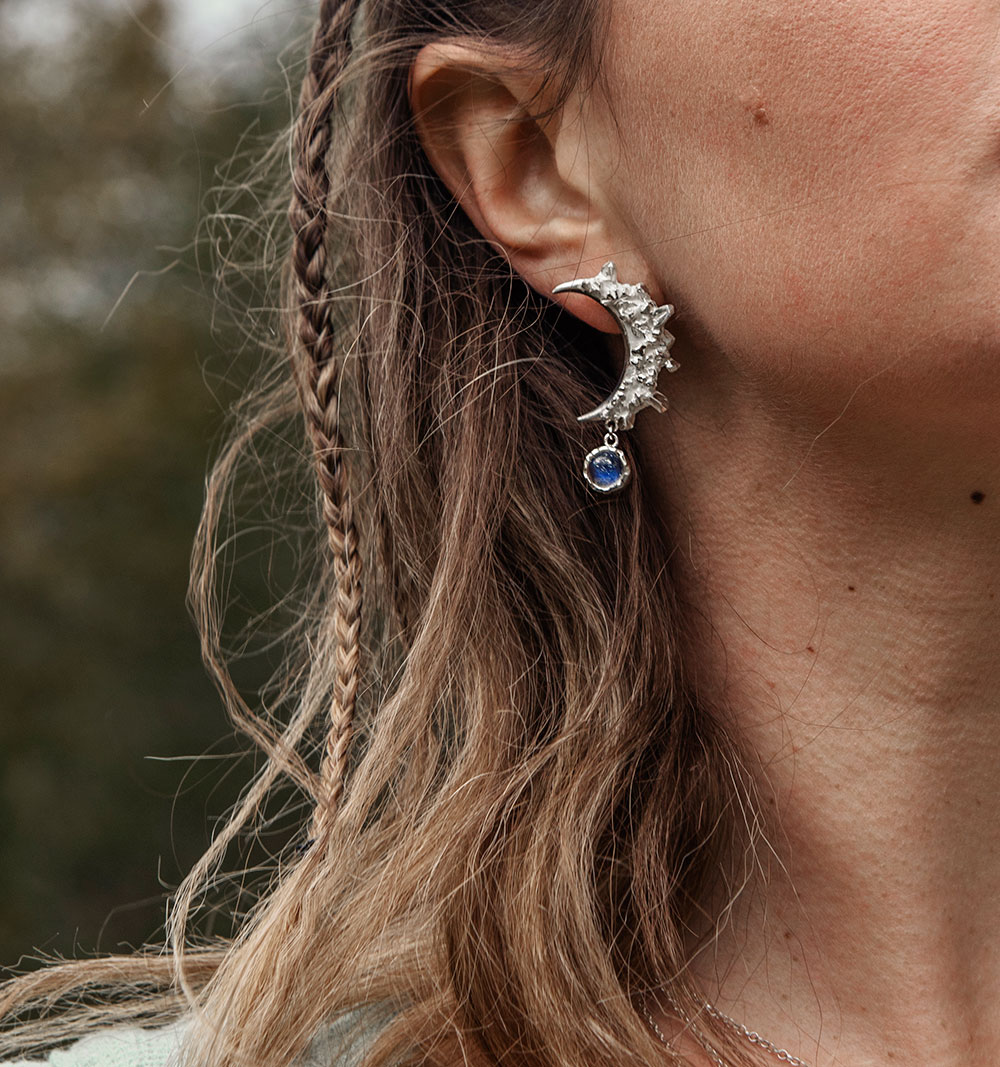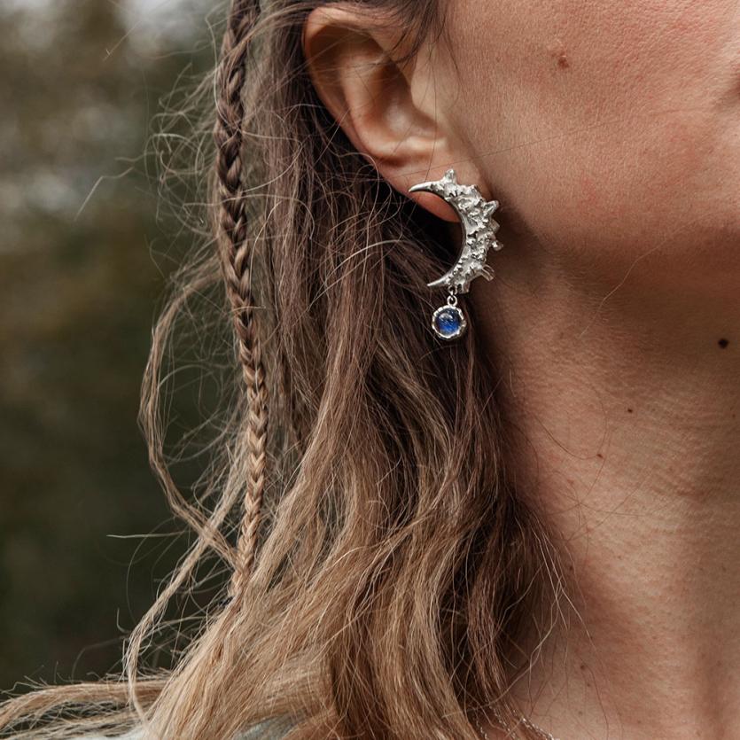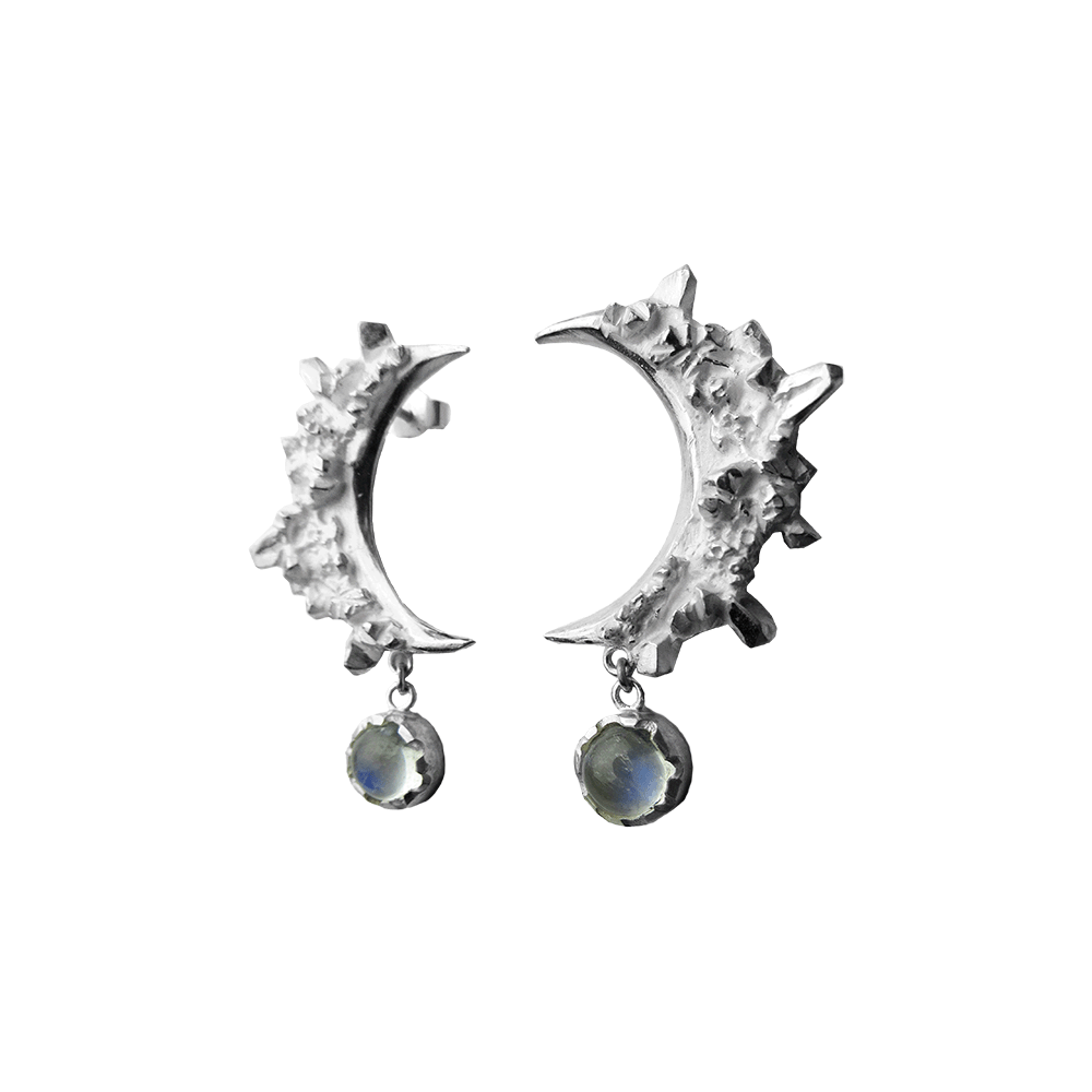 Srebrni uhani s čudovitimi belimi labradoriti, ki odsevajo svetlobo kot kapljice vode. Uhani z motivom lune ustvarjajo dinamično igro med čistimi, gladkimi linijami in organsko rastjo kristalov.