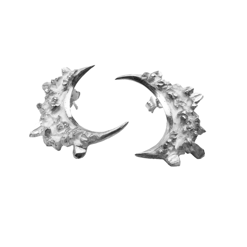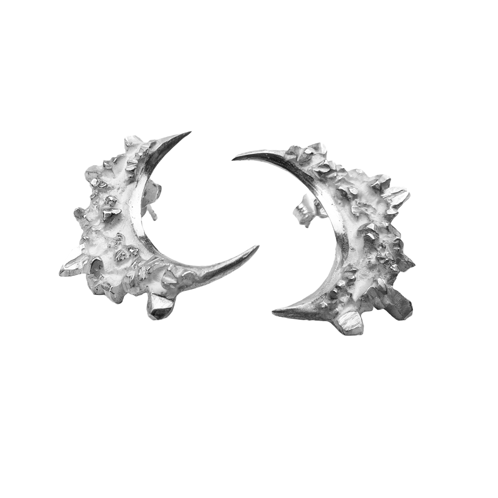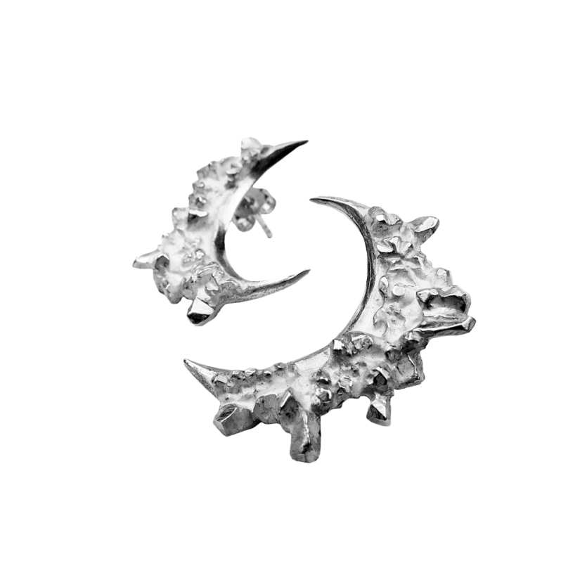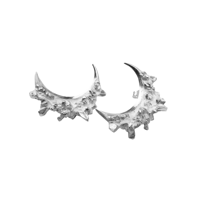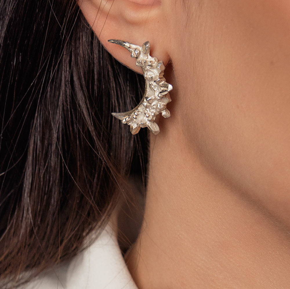 Čudoviti srebrni uhani z motivom lune ustvarjajo dinamično igro med čistimi, gladkimi linijami in organsko rastjo kristalov.