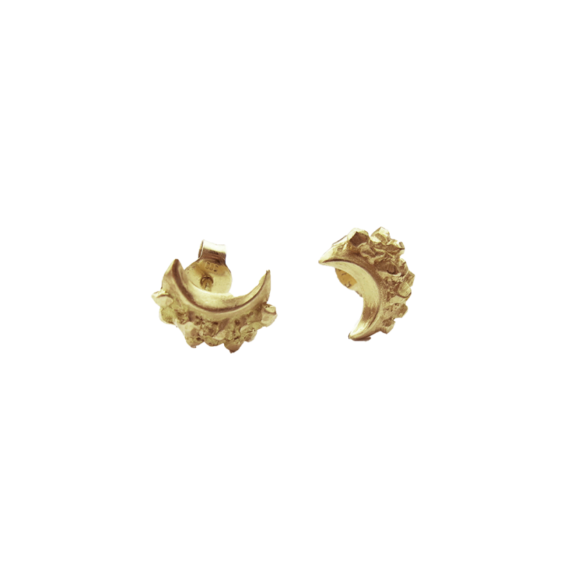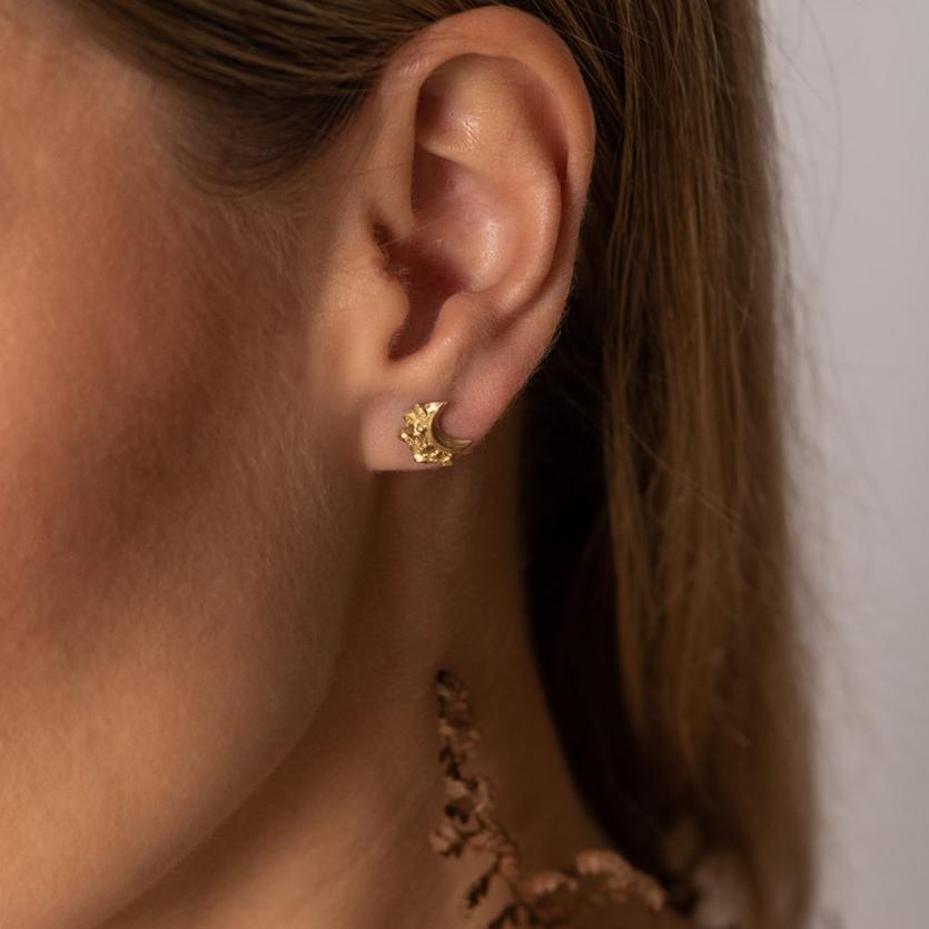 Očarljivi drobni uhani so nežno oblikovani v obliko polmeseca. Kristalna tekstura in topel objem 18-karatnega rumenega zlata dodajata disketen pridih luksuza vašemu vsakdanjemu videzu. Ti uhani nosijo globok simbolizem, ki uteleša ženstvene vidike življenja - od čudežnih začetkov rojstva do nenehnih ciklov rasti in obnavljanja.