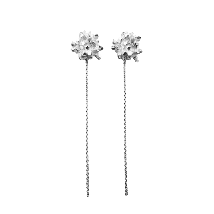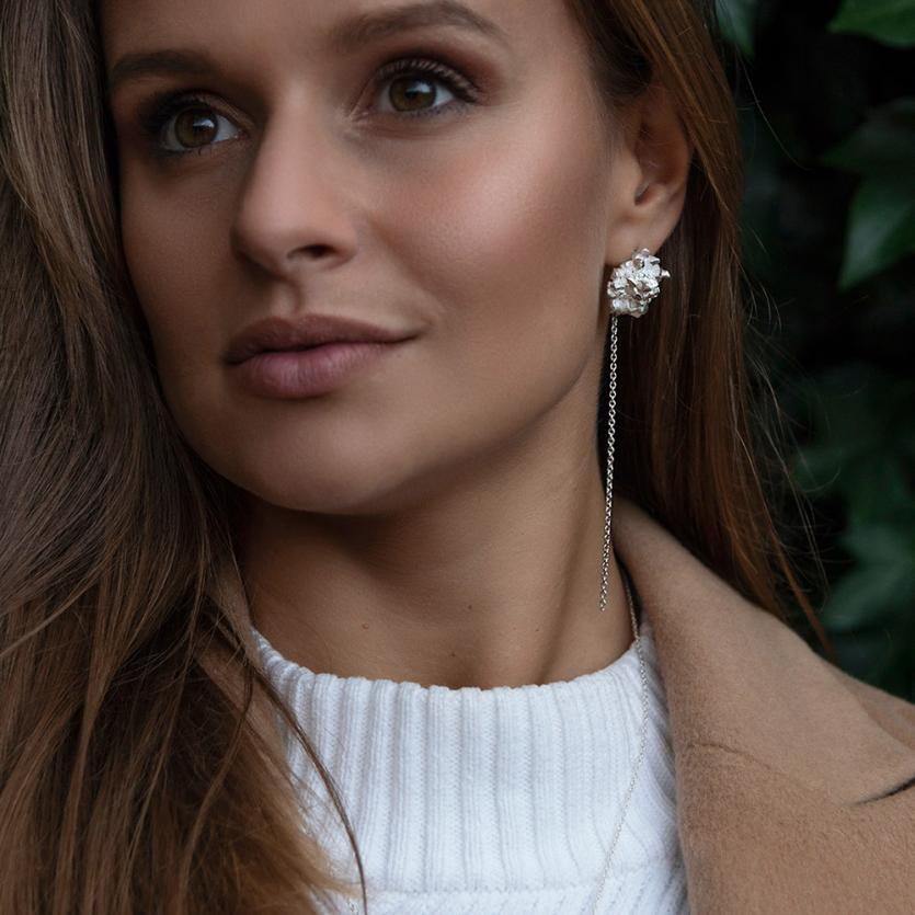 Glamurozni uhani s strukturo kristalnih cvetov in dolgo verižico, ki poudarjajo linijo vratu.