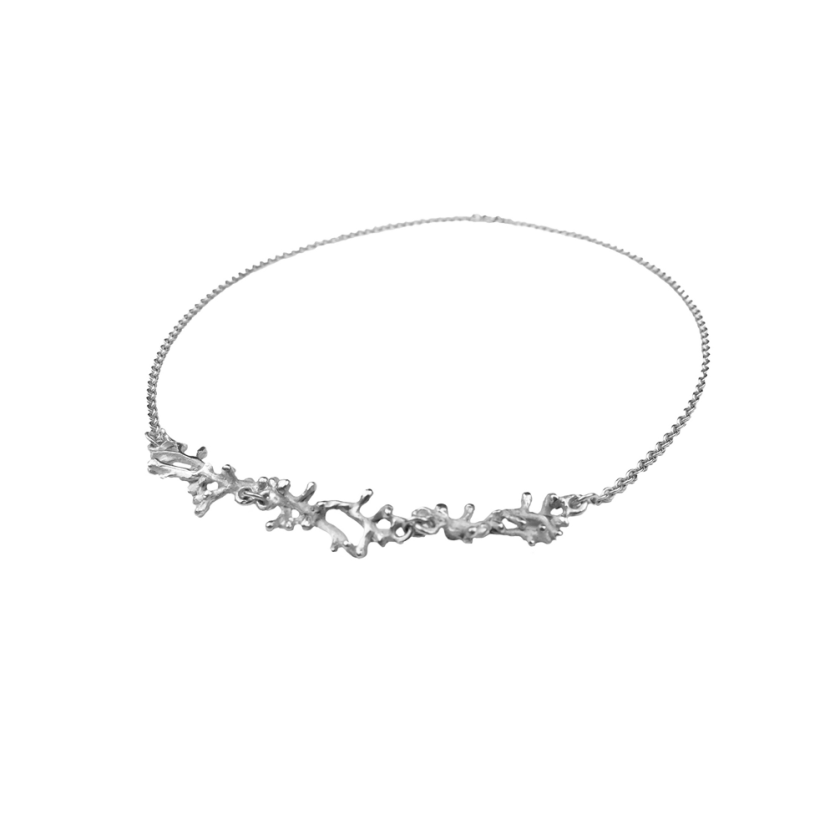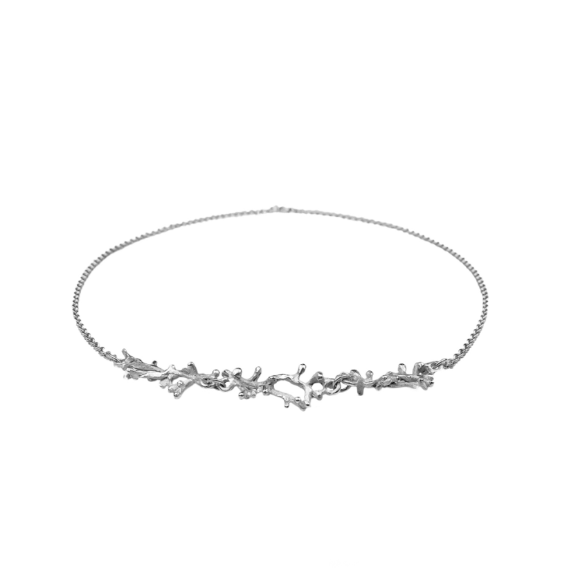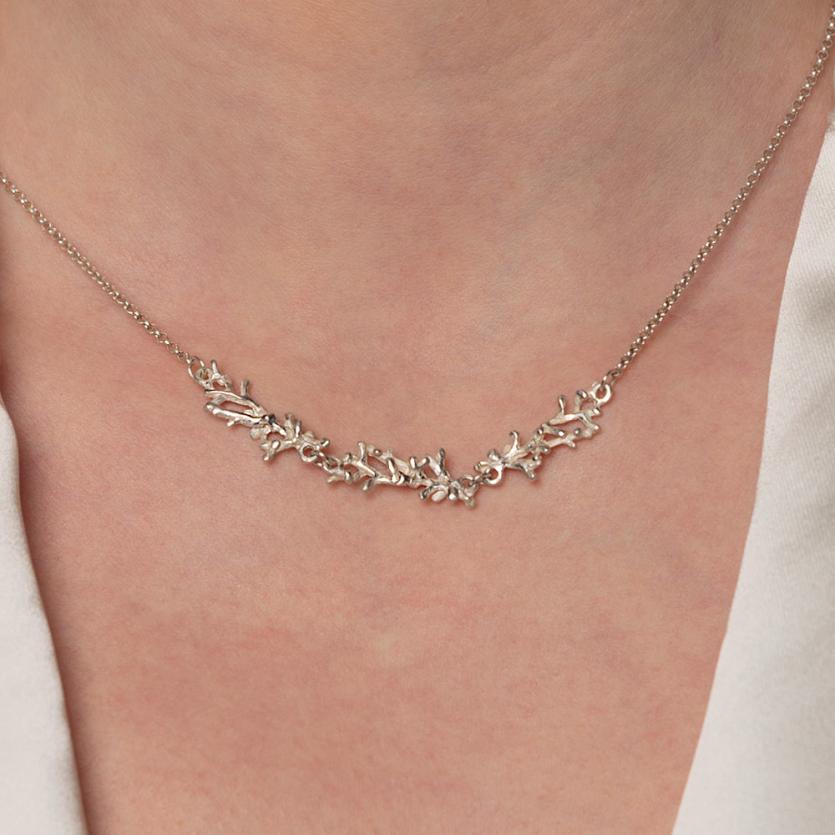Nežna ogrlica s prepletajočim motivom korale za sodobno morsko deklico. Za igriv videz jo kombinirajte z daljšimi srebrnimi ogrlicami.