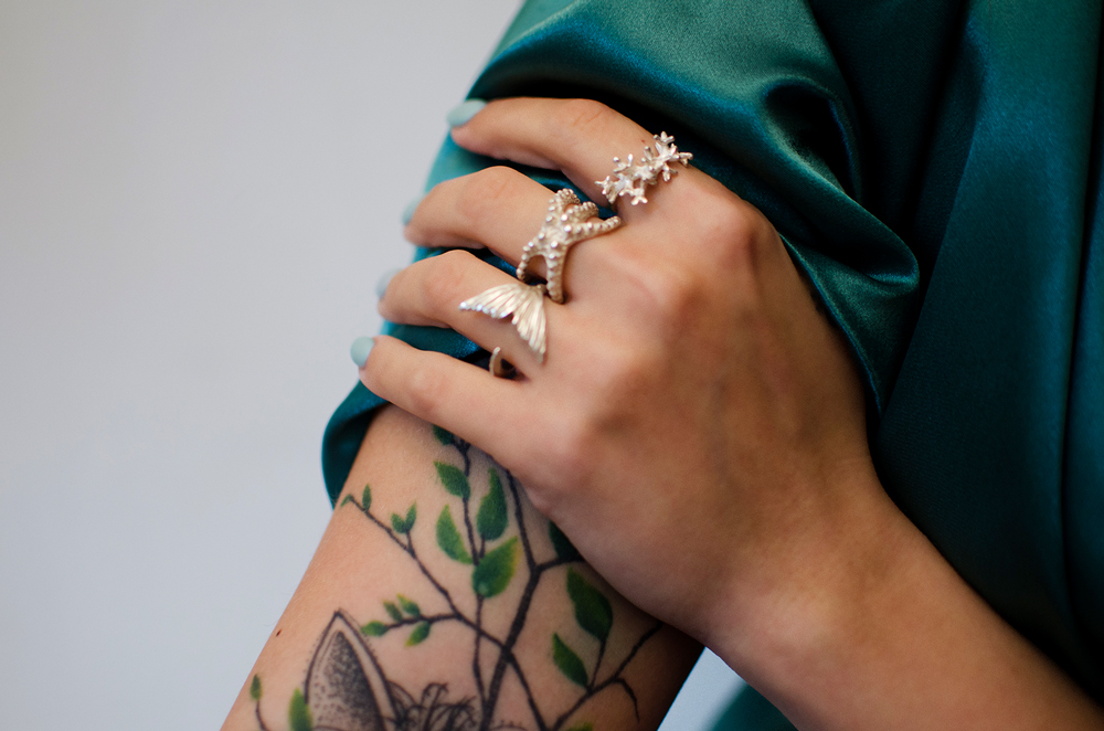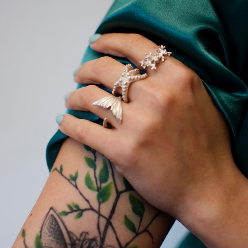 Pri kolekciji 'Morsko življenje' se vse vrti okoli organskih koralnih oblik in prebivalcev morskih globin. Prstani dajejo vtis, kot da so iztrgani iz samega osrčja koralnega grebena; ogrlice in uhani na vašem telesu valovijo nežno kot v objemu morskega toka. Kolekcija je namenjena posameznikom, ki ljubijo skrivnosti morskih globin in si ob sebi vedno želijo imeti delček morja.