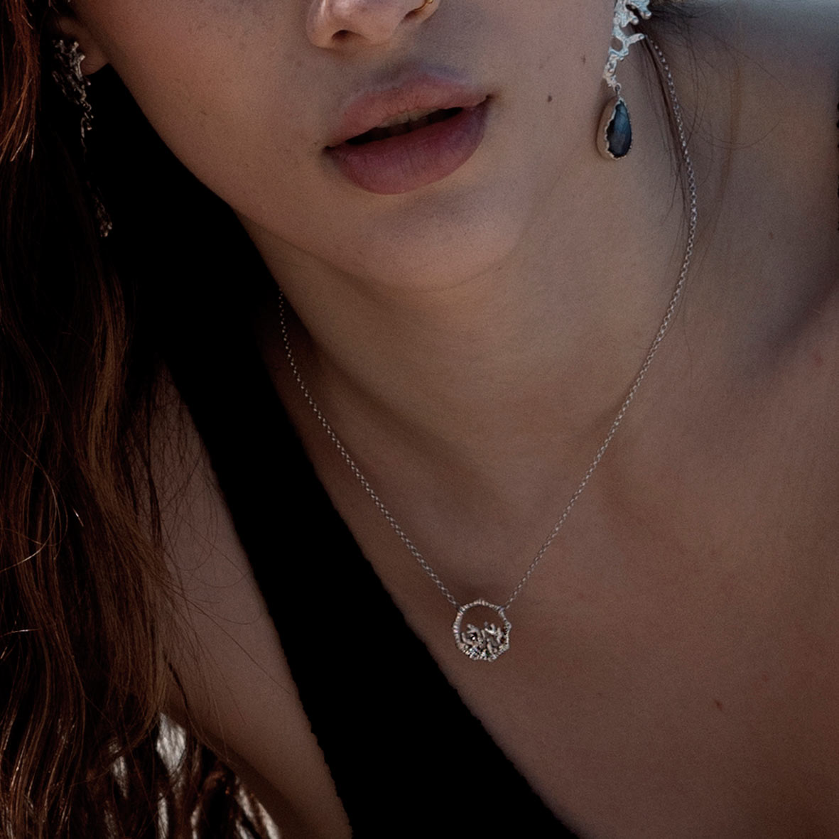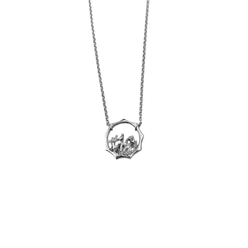 Odkrijte prefinjeno lepoto srebrne ogrlice, ki združuje eleganco s surovo lepoto koral. Koralni greben se razcveta v svoji polni lepoti znotraj oboda. Na eni strani je obod gladek, na drugi strani pa nežno teksturiran.