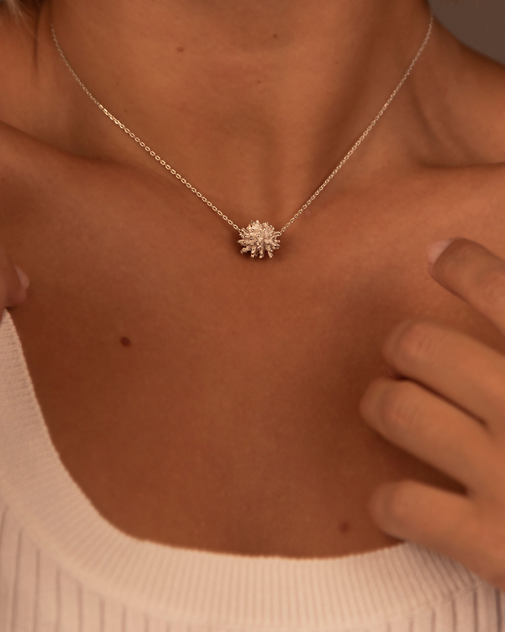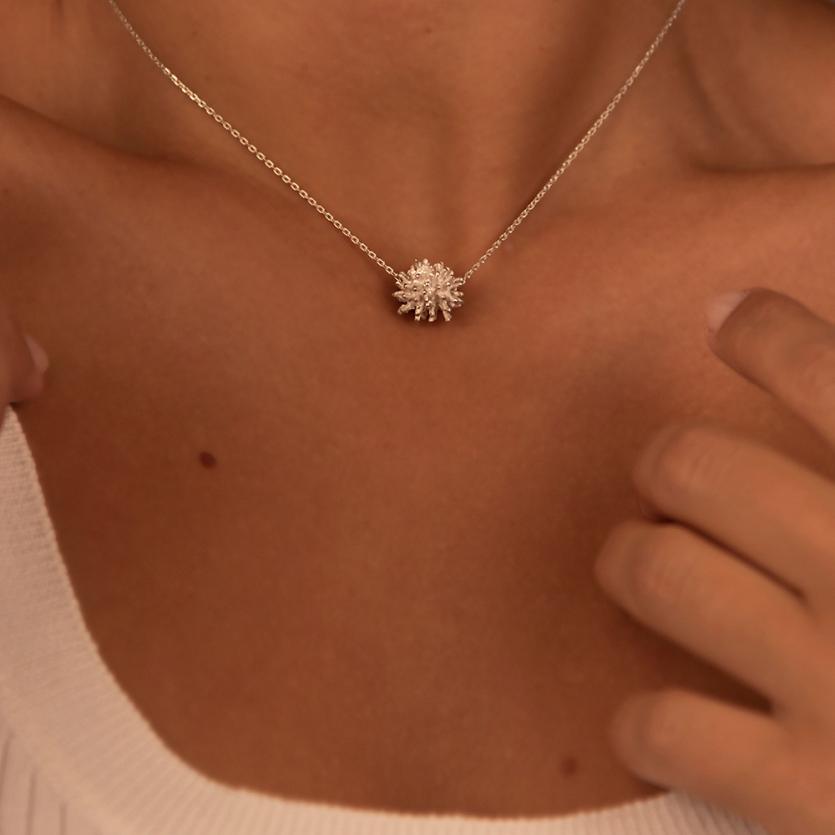 Prikupna ogrlica z motivom morskega ježka, se nosi tik ob vratu. Kombinirajte jo z verižicami iz kolekcije Morskega življenja.