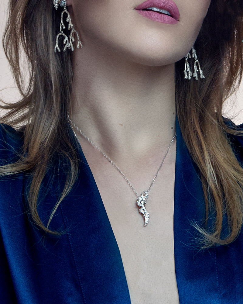 Pri kolekciji 'Morsko življenje' se vse vrti okoli organskih koralnih oblik in prebivalcev morskih globin. Prstani dajejo vtis, kot da so iztrgani iz samega osrčja koralnega grebena; ogrlice in uhani na vašem telesu valovijo nežno kot v objemu morskega toka. Kolekcija je namenjena posameznikom, ki ljubijo skrivnosti morskih globin in si ob sebi vedno želijo imeti delček morja.