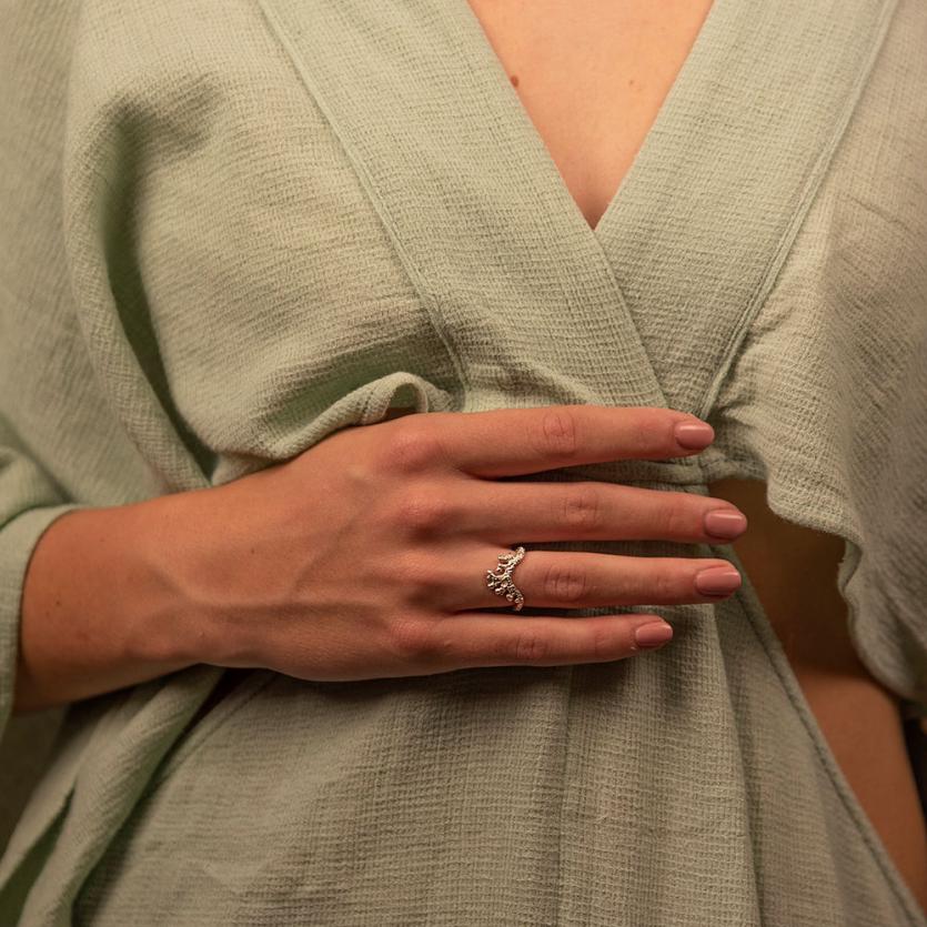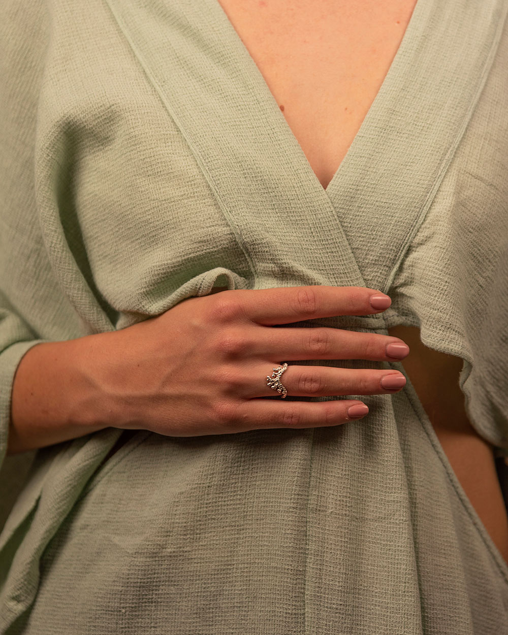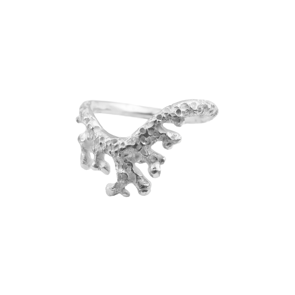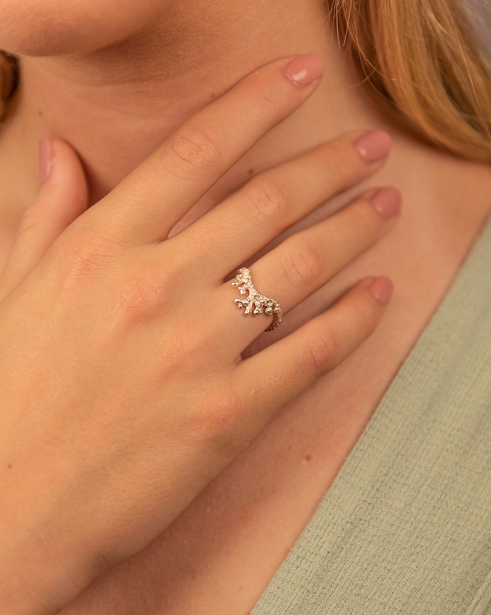Nežen prstan s koralno strukturo v obliki črke U bo na vaših rokah pričaral občutek morske lahkotnosti. Za igriv videz ga nosite v kombinaciji z drugimi prstani.