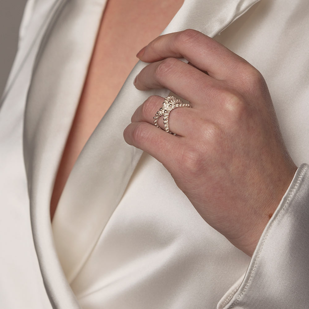 Pri kolekciji 'Morsko življenje' se vse vrti okoli organskih koralnih oblik in prebivalcev morskih globin. Prstani dajejo vtis, kot da so iztrgani iz samega osrčja koralnega grebena; ogrlice in uhani na vašem telesu valovijo nežno kot v objemu morskega toka. Kolekcija je namenjena posameznikom, ki ljubijo skrivnosti morskih globin in si ob sebi vedno želijo imeti delček morja.