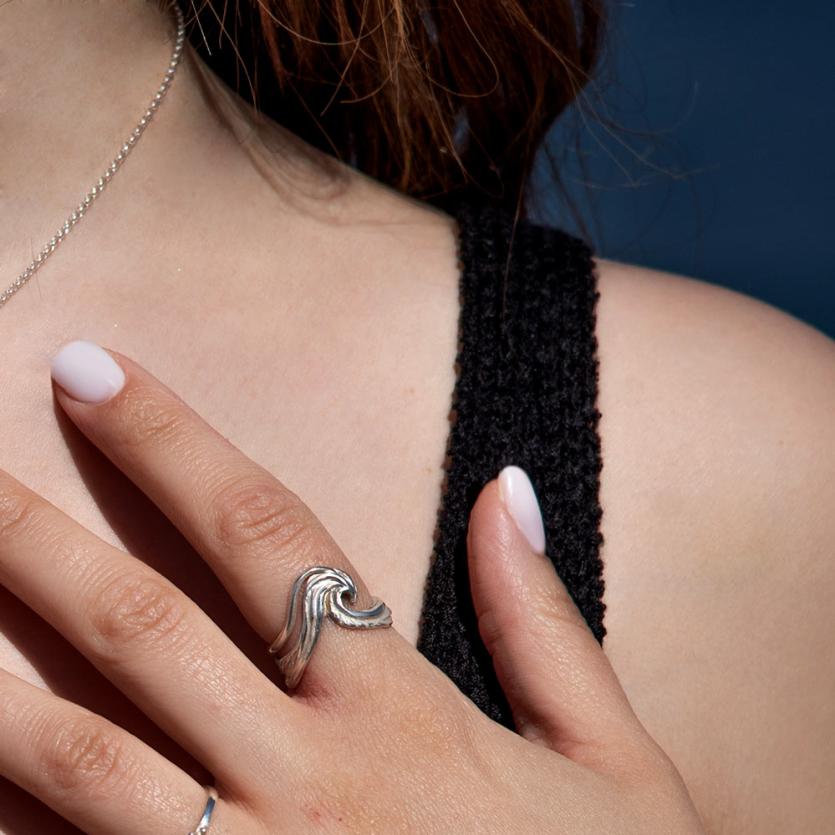 Osupljiv prstan, ki s svojo teksturo in obliko posnema ples morskih valov. Nosite ga kot izstopajoč osrednji kos ali v družbi drugih prstanov kolekcije Morskega življenja za razkošen videz.