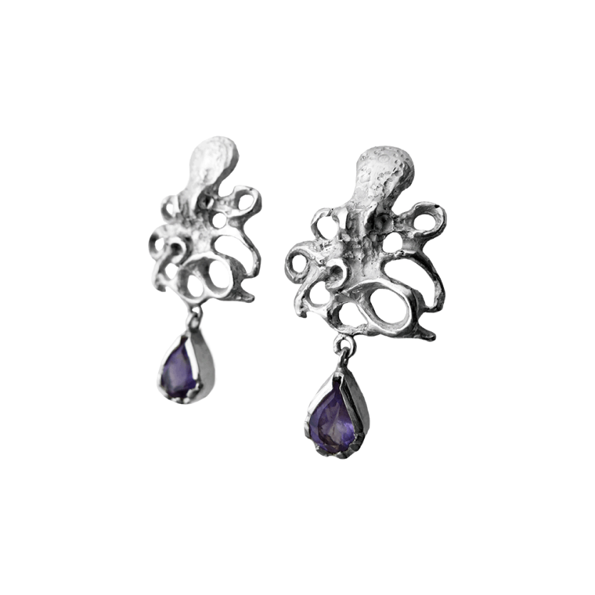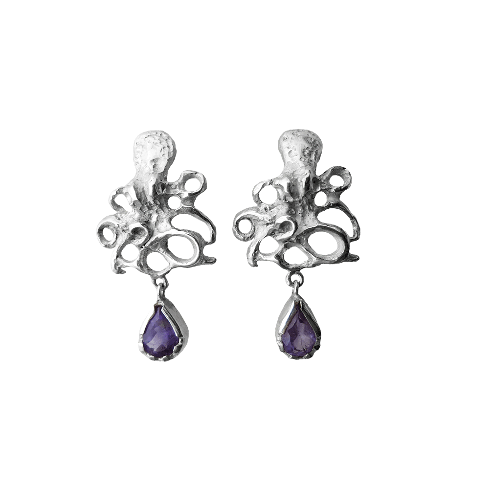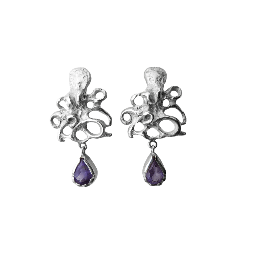 Očarljivi srebrni uhani v obliki hobotnice z intenzivno vijoličnima ametistoma, so popolna izbira za vse ljubitelje morja in morske simbolike. Ametist, kamen duhovne jasnosti in notranjega ravnovesja, prinaša občutek miru ter intuicije, hkrati pa dodaja pridih skrivnostne elegance.
