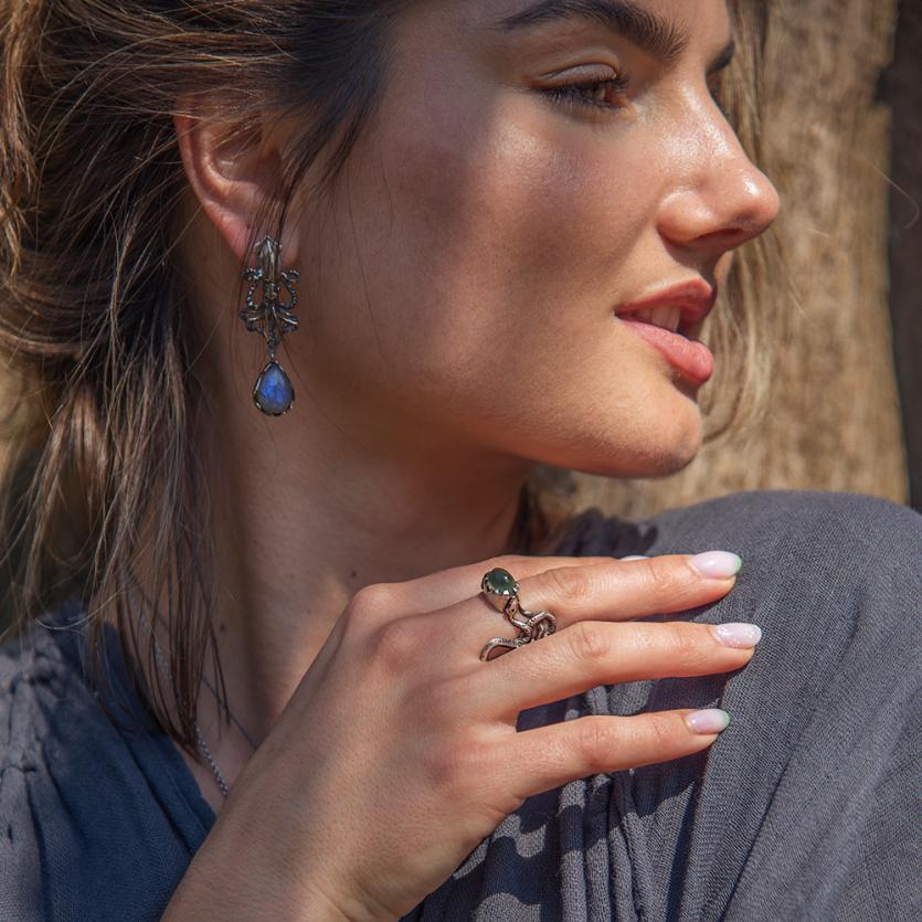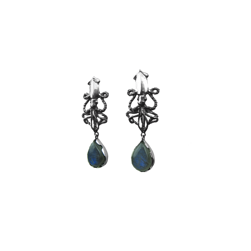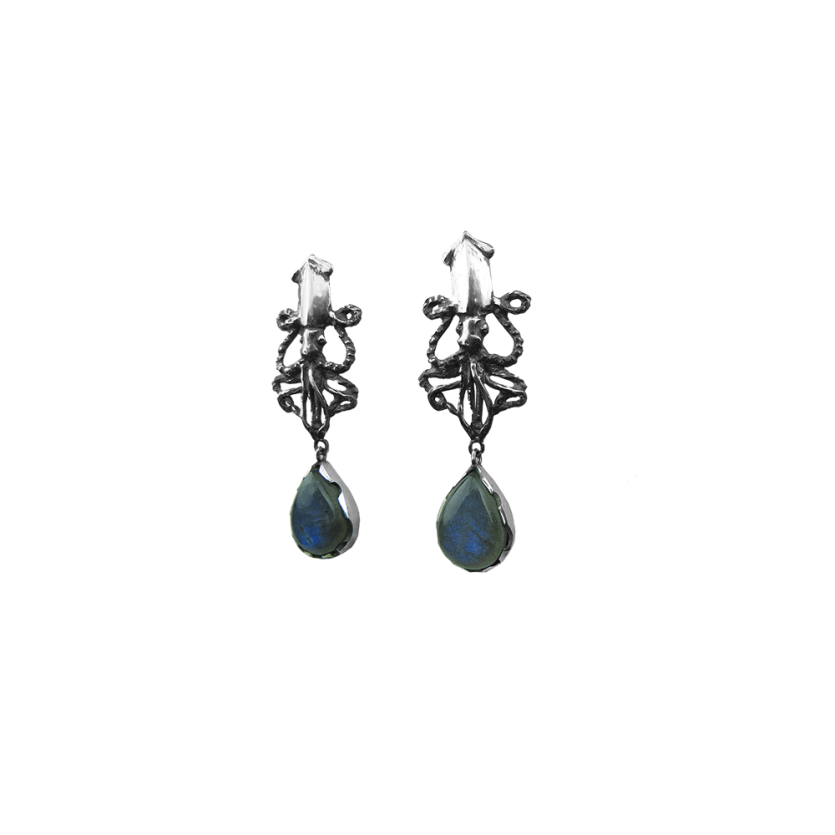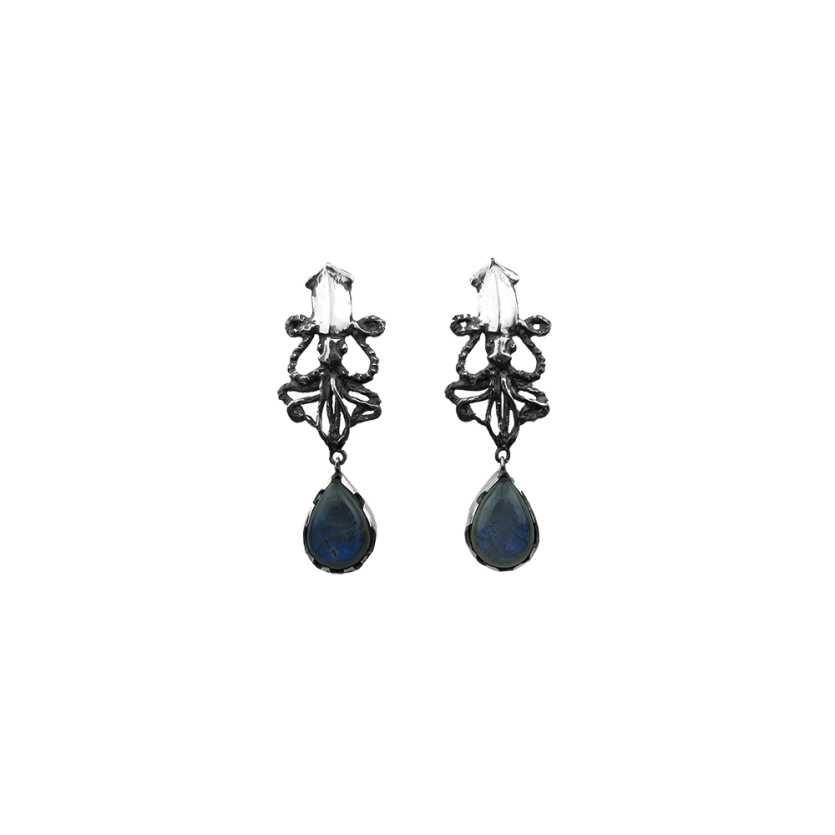 Dramatični uhani z motivom mitološkega bitja iz morskih globin. Črni labradorit s svojim globokim modrim leskom čudovito dopolni morsko legendo.