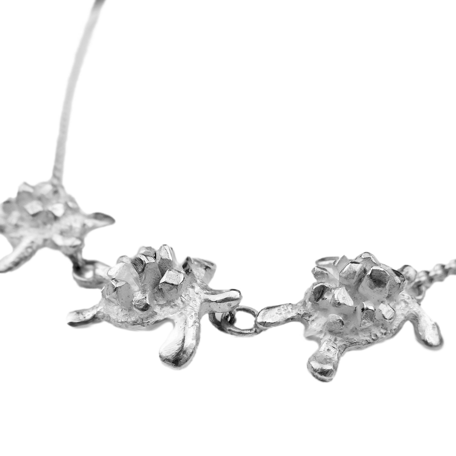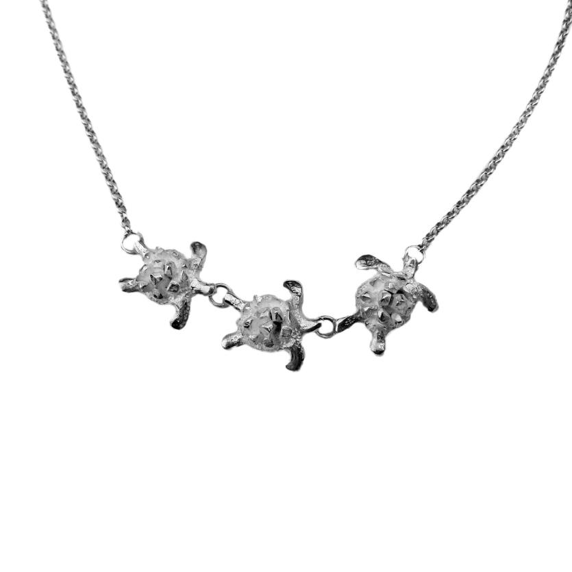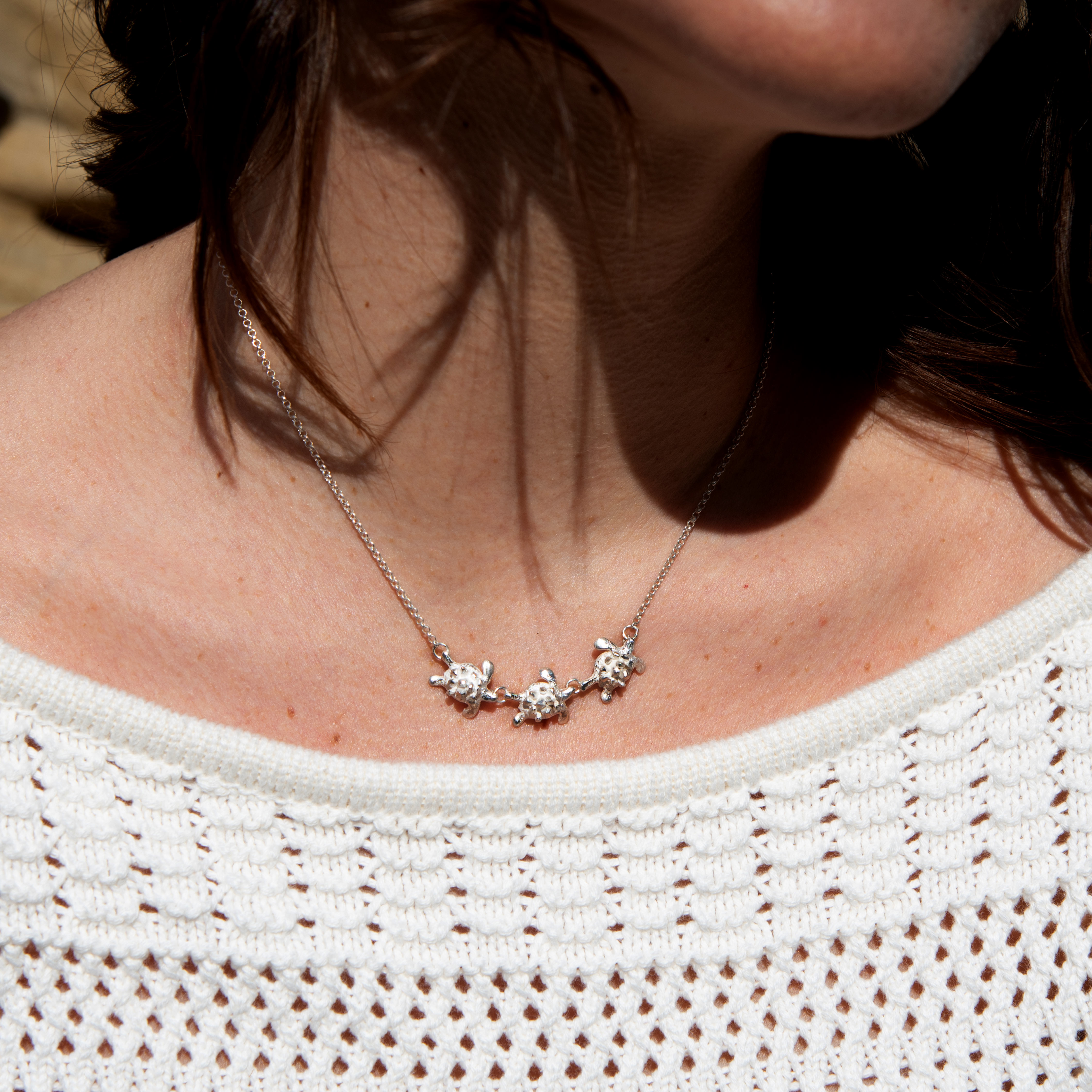 Ogrlica z motivom treh ljubkih morskih želv, nežno nanizanih ena za drugo. Vsaka želva nosi na svojem hrbtu teksturo kristalov.