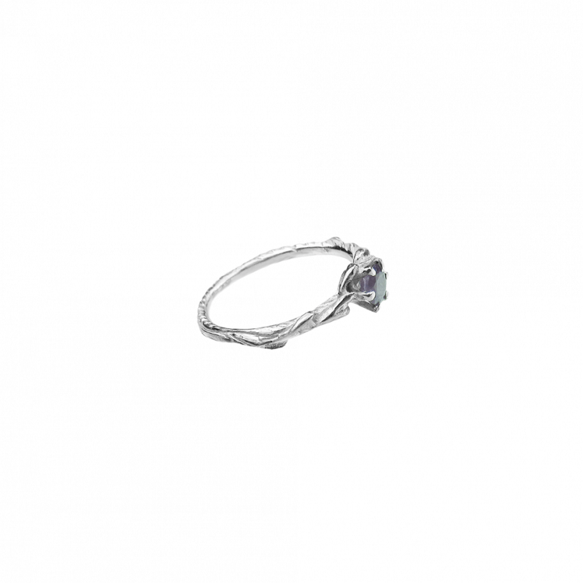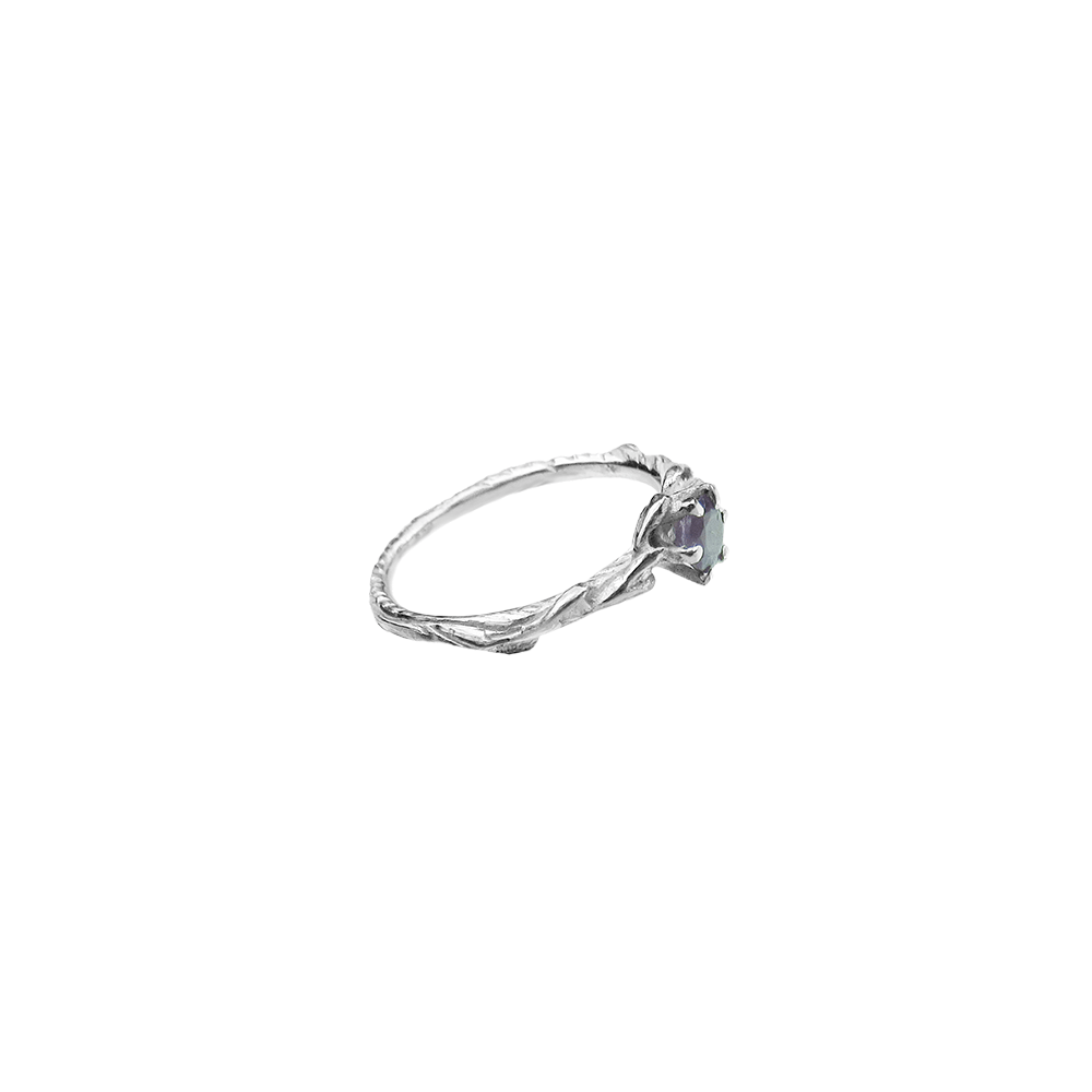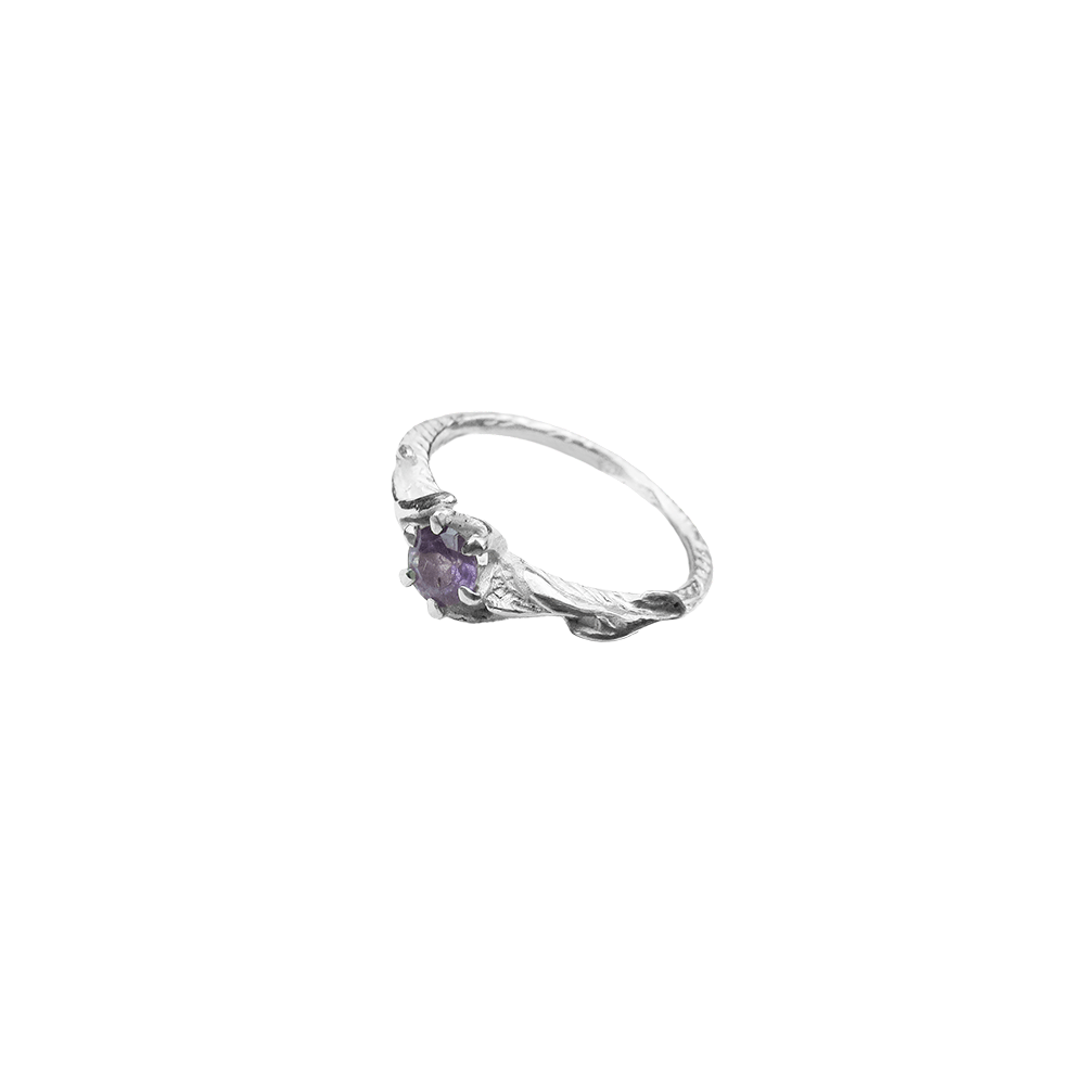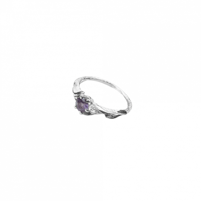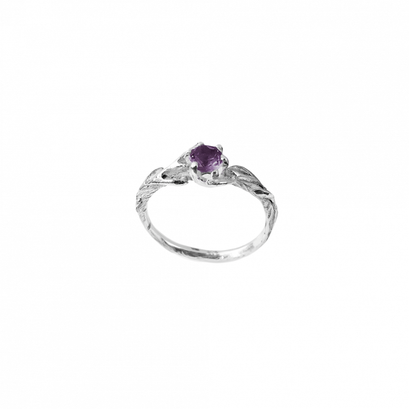 Ljubek zaročni prstan s teksturo gozda in detajli vejic, ki obdajajo nežno vijoličen dragulj, ametist. Prstan je možno naročiti tudi v belem, rožnatem ali rumenem zlatu, v kombinaciji z diamantom ali katerim drugim draguljem po izbiri.