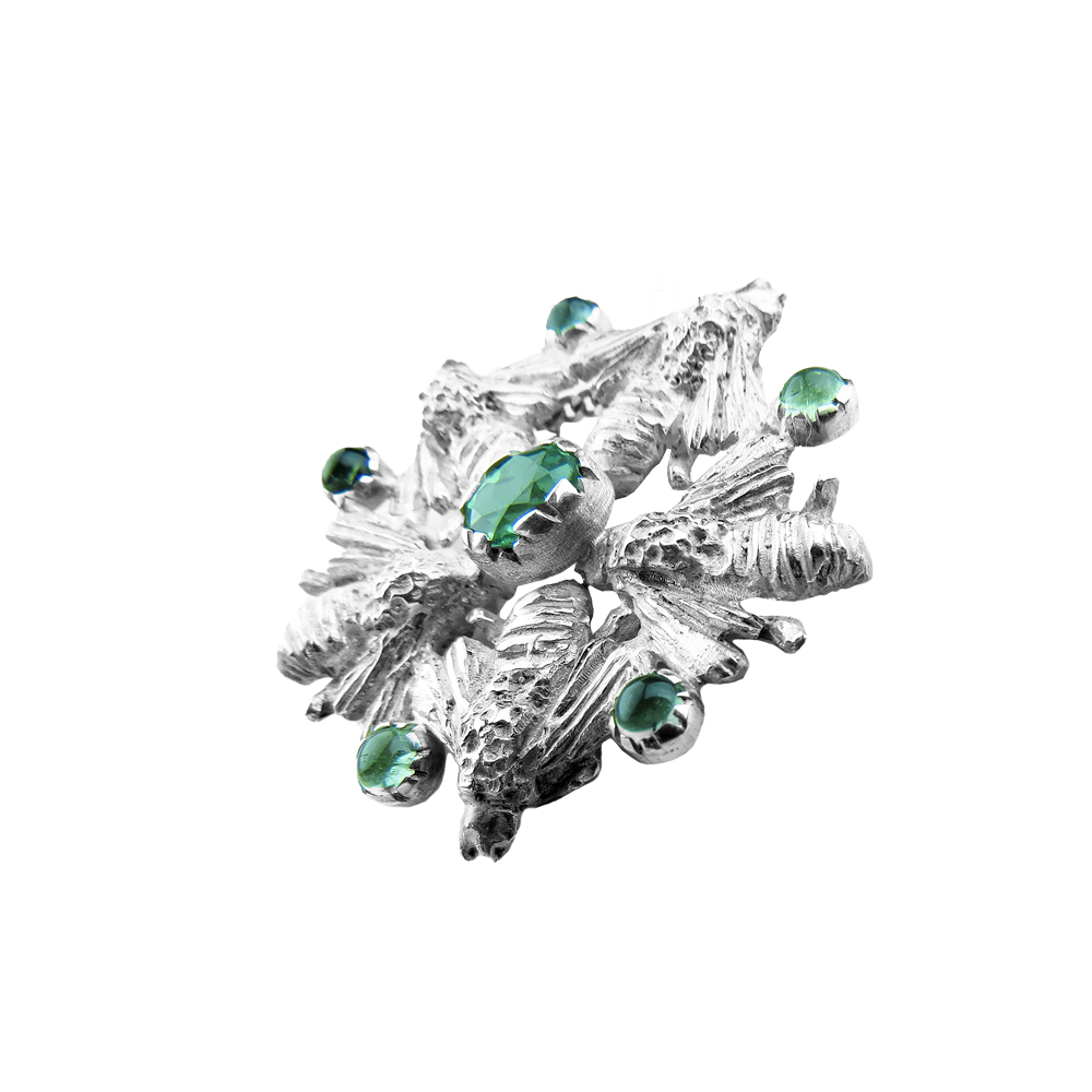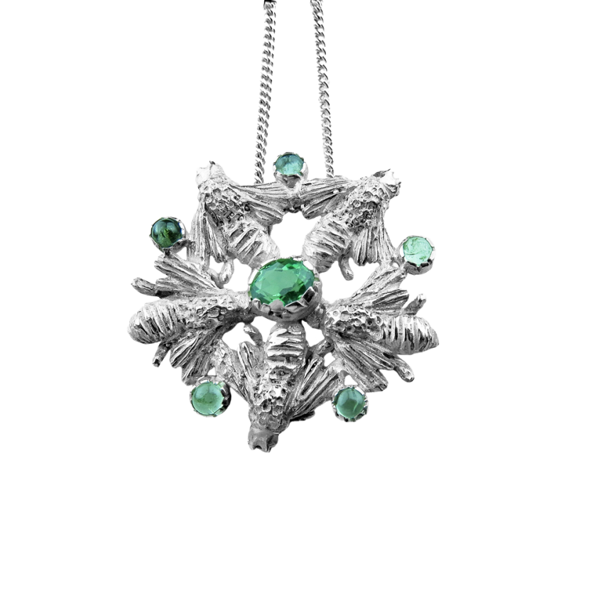 Čudovita mojstrovina v kompoziciji plesa petih čebel in intenzivno zelenih turmalinov. Med petimi čebelami je skrbno izbranih pet zelenih turmalinov. V središču pa se prav tako nahaja čudovit primerek tovrstnega žlahtnega kamna.
