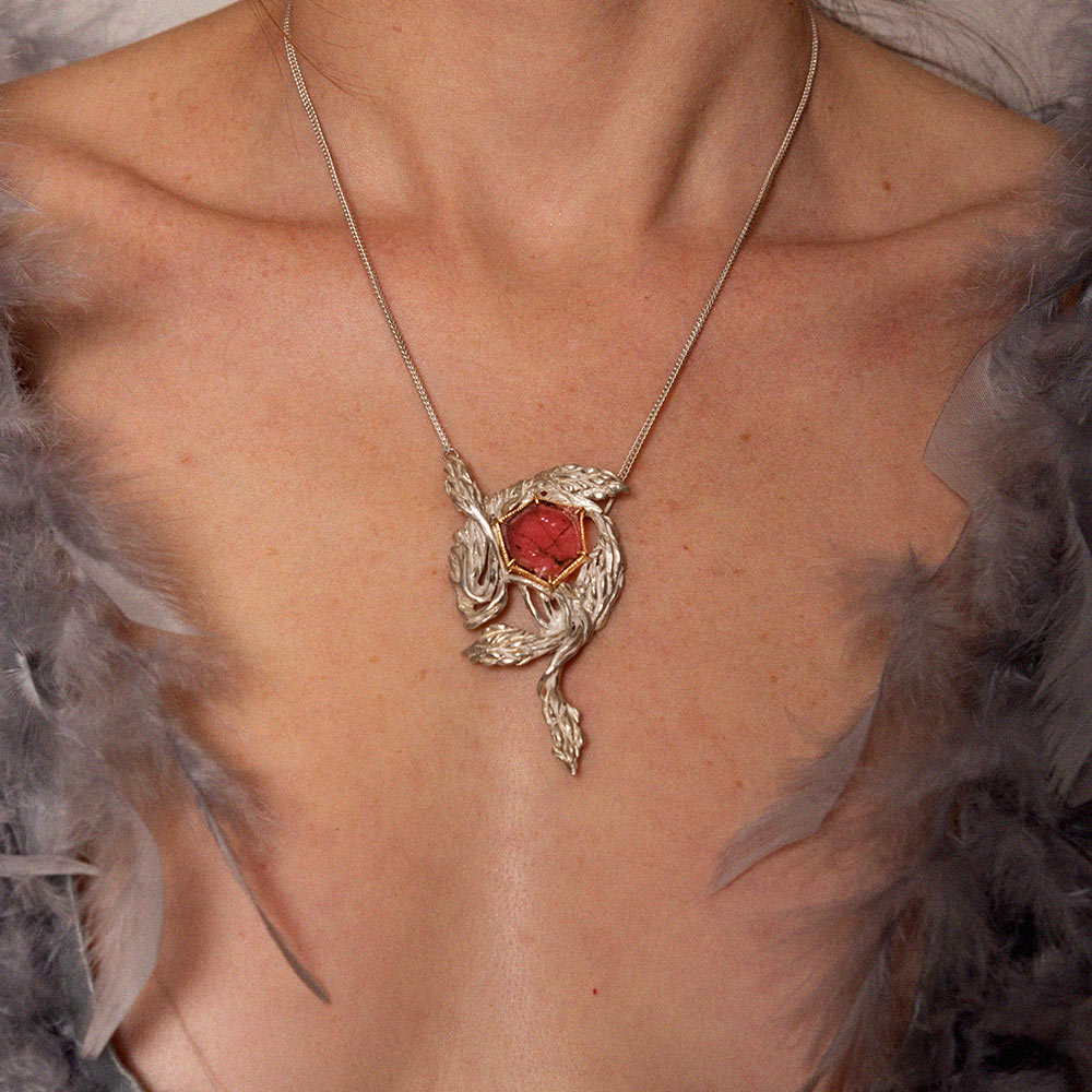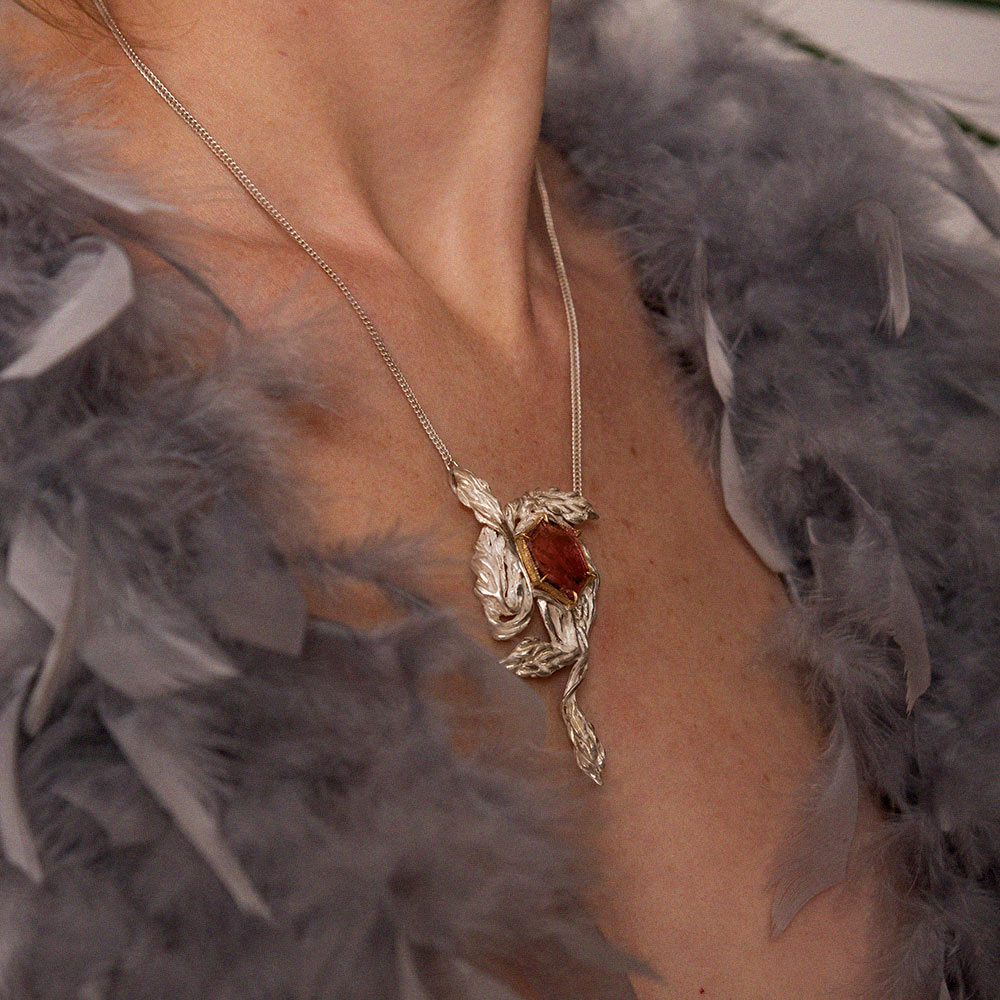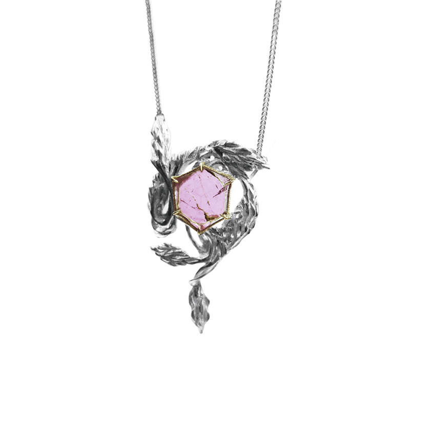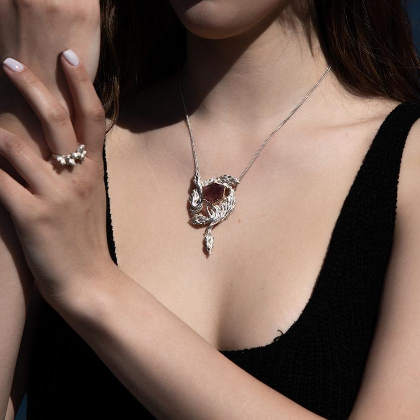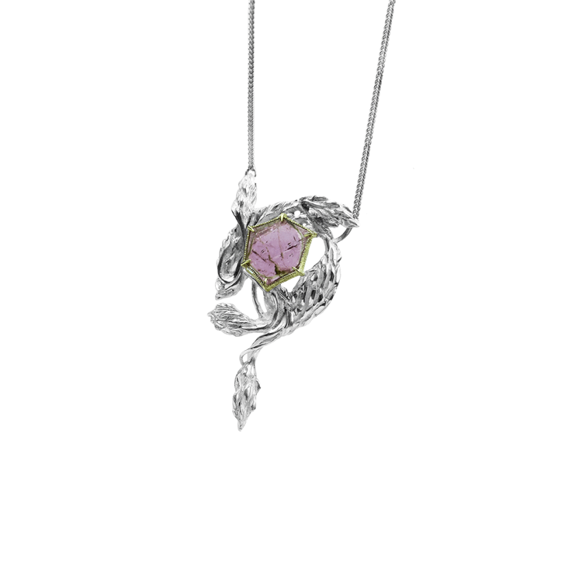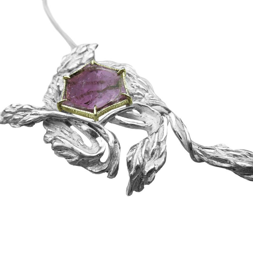 Ta edinstvena srebrna ogrlica, navdihnjena z romantiko preteklih obdobij in domišljijsko fantazijo, prinaša pridih zgodovine v sodobno eleganco. Motivi prepletajočih se glicinij so skrbno oblikovani v srebru, kar ustvarja čarobno vzdušje nežnosti in prefinjenosti. V središču ogrlice je surov kristal turmalina, obdan z 18-karatnim zlatim okovjem, ki poudarja njegovo naravno lepoto in dodaja pridih razkošja. Ogrlica se odlično poda k globokim izrezom, saj njena edinstvena oblika nežno sledi linijam vratu in prinaša čutno eleganco, ki pritegne poglede. Idealna izbira za vse, ki iščejo unikaten kos nakita z dušo.