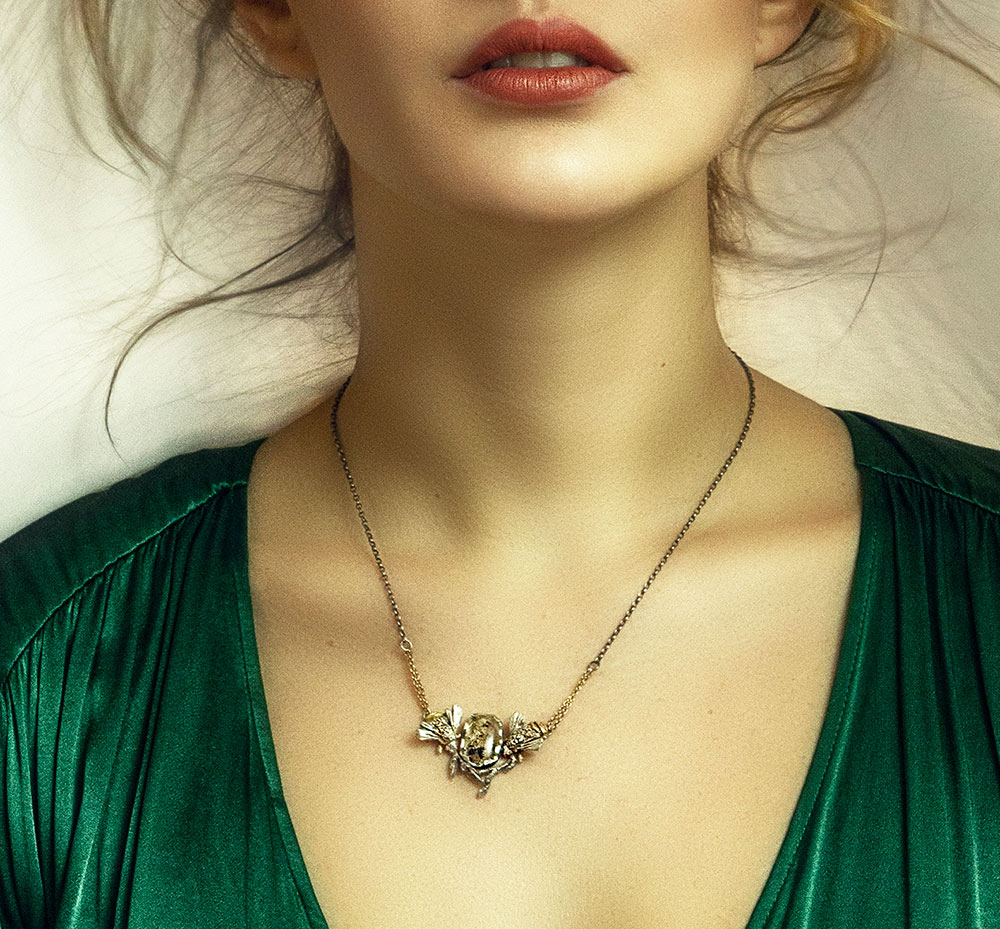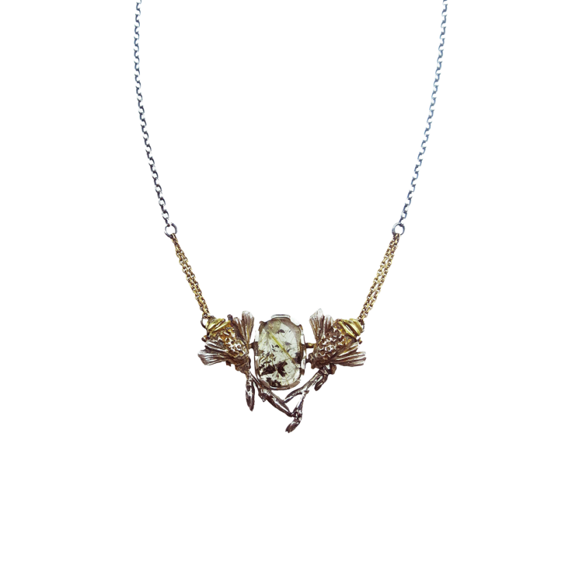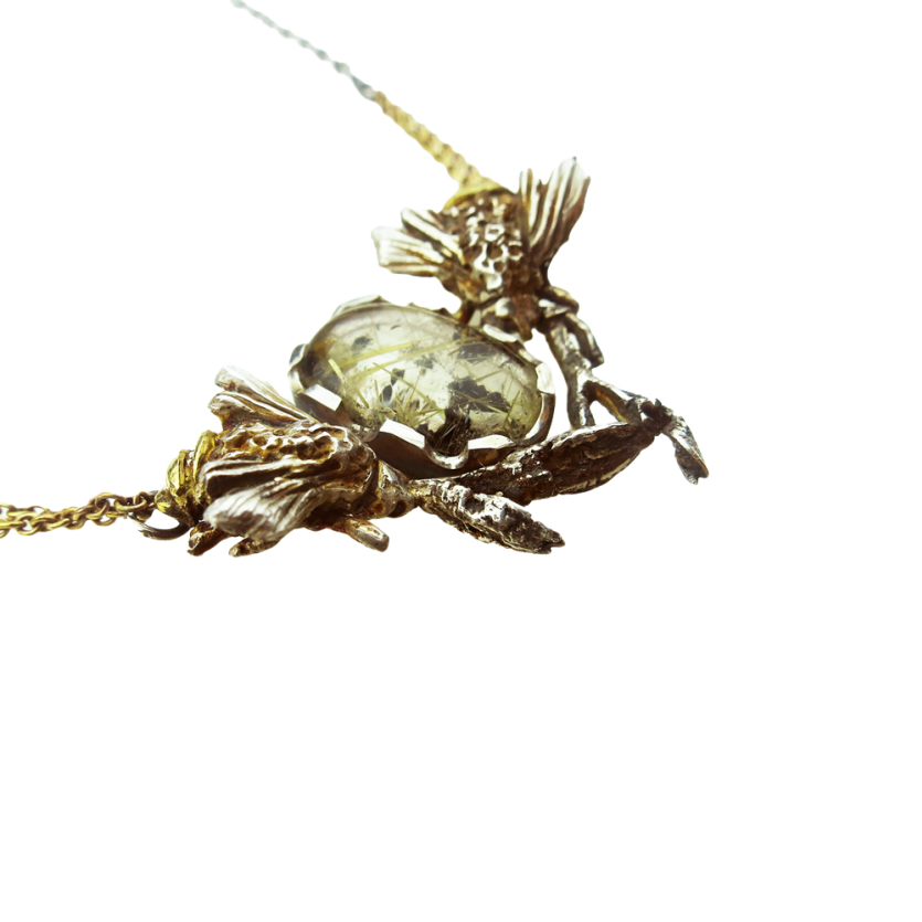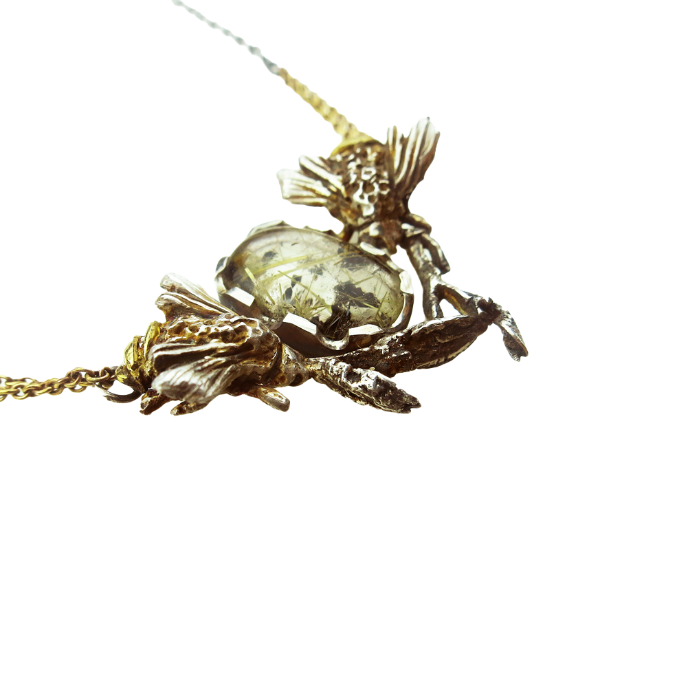 Pravljična ogrlica v kombinaciji temnega srebra in zlata je prava paša za oči. Srebrni čebelici, ki sta olepšani z zlatimi detajli, sta prepleteni v trikotno kompozicijo z gozdnimi vejicami in fascinantnim rutilnim kremenom. Verižice na ogrlici so narejene iz kombinacije 14-karatnega rumenega zlata iz oksidiranega srebra.