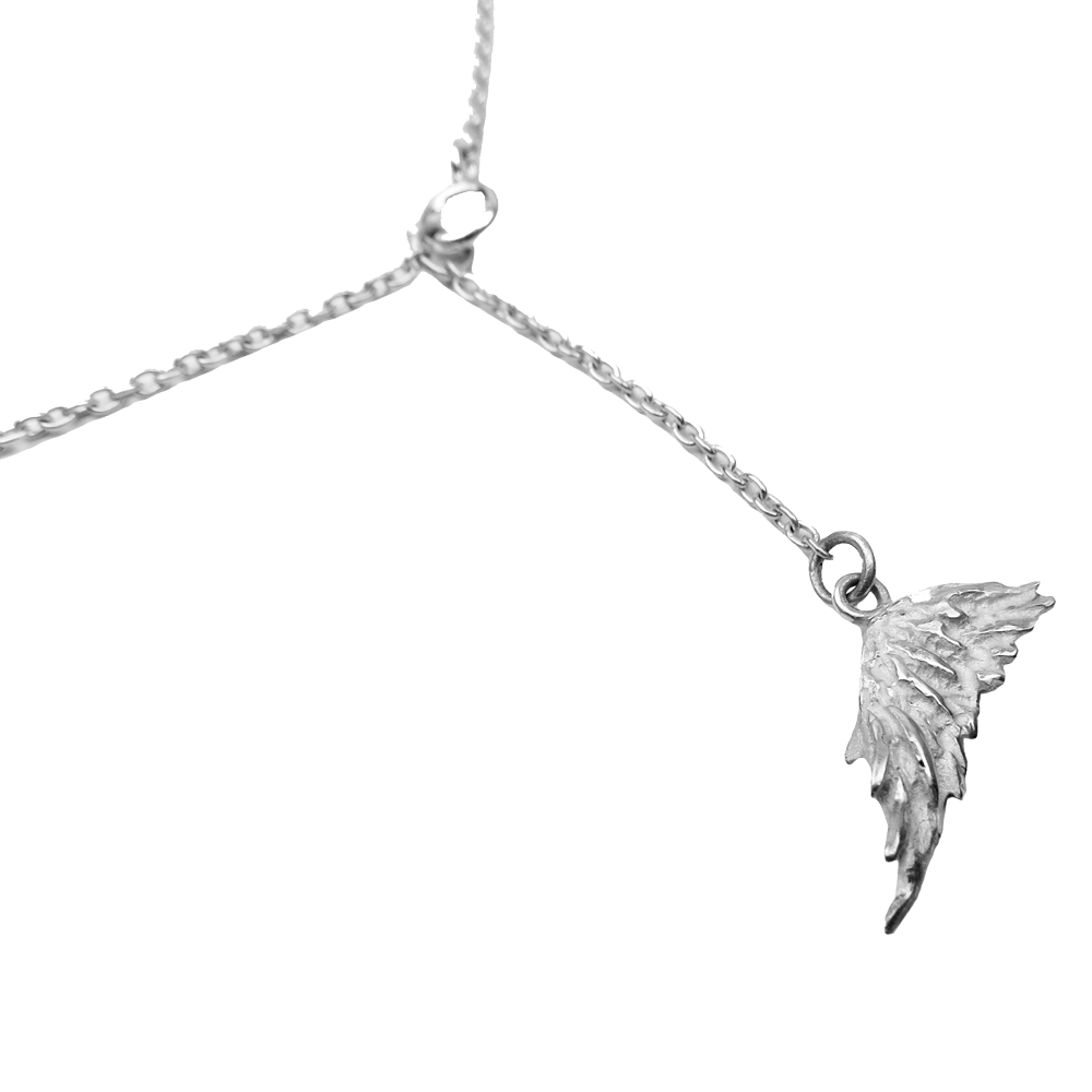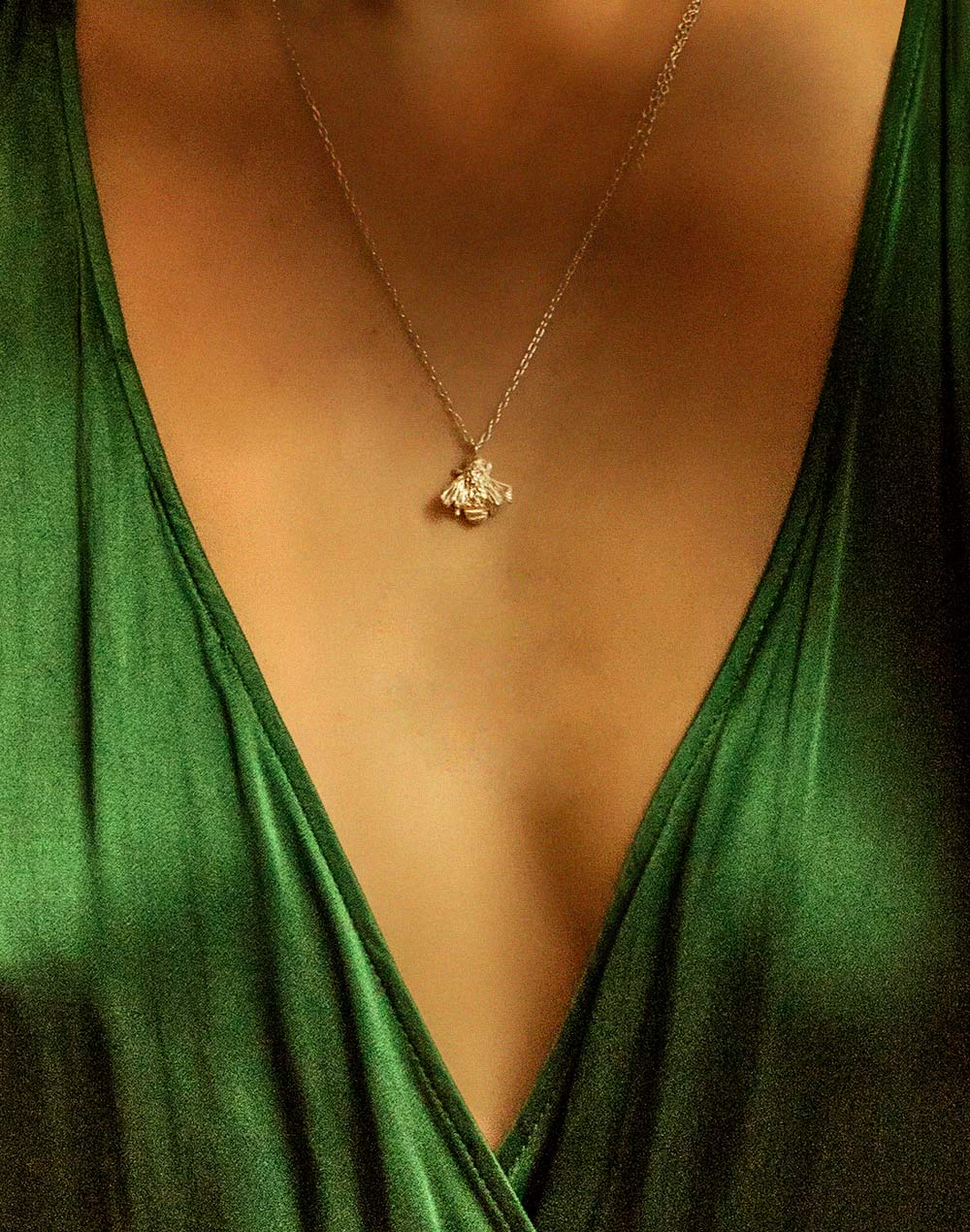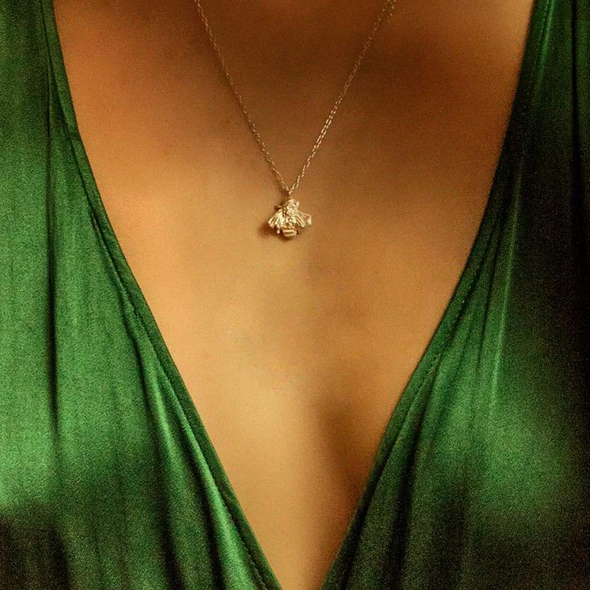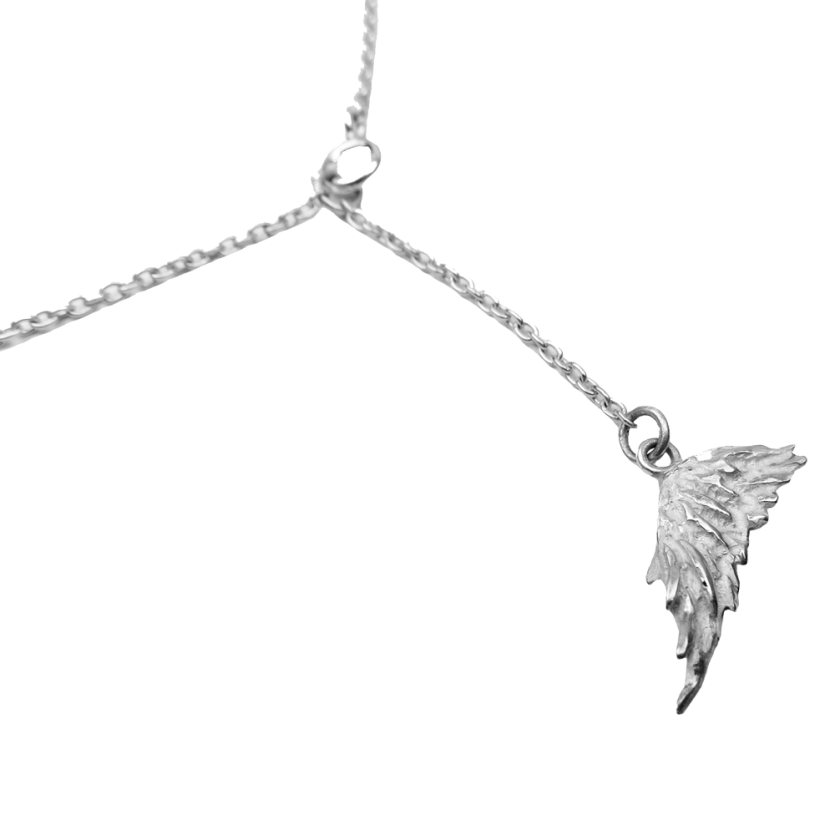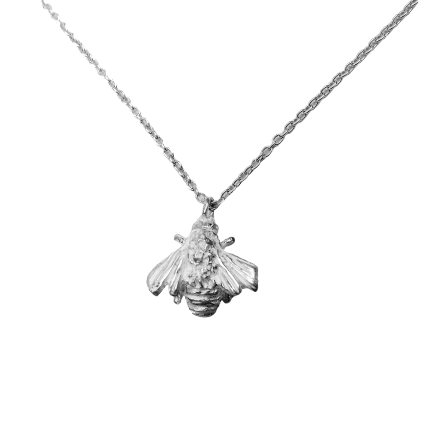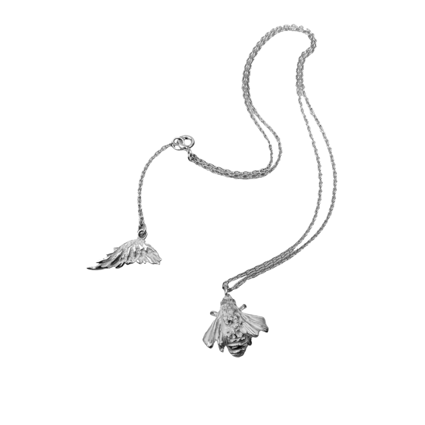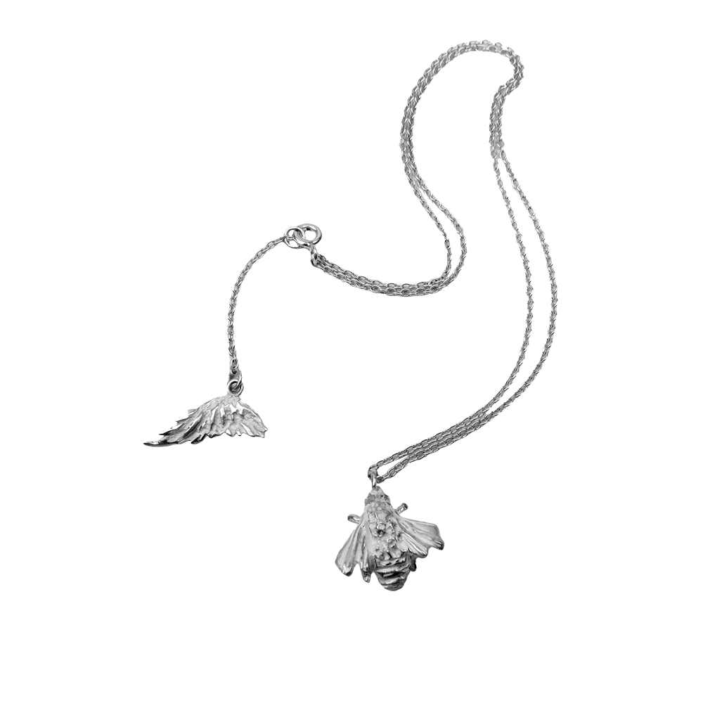 Ljubka srebrna ogrlica z motivom čebelice na sprednjem delu in detajlom perutničke na hrbtni strani. Nastavljive velikosti.