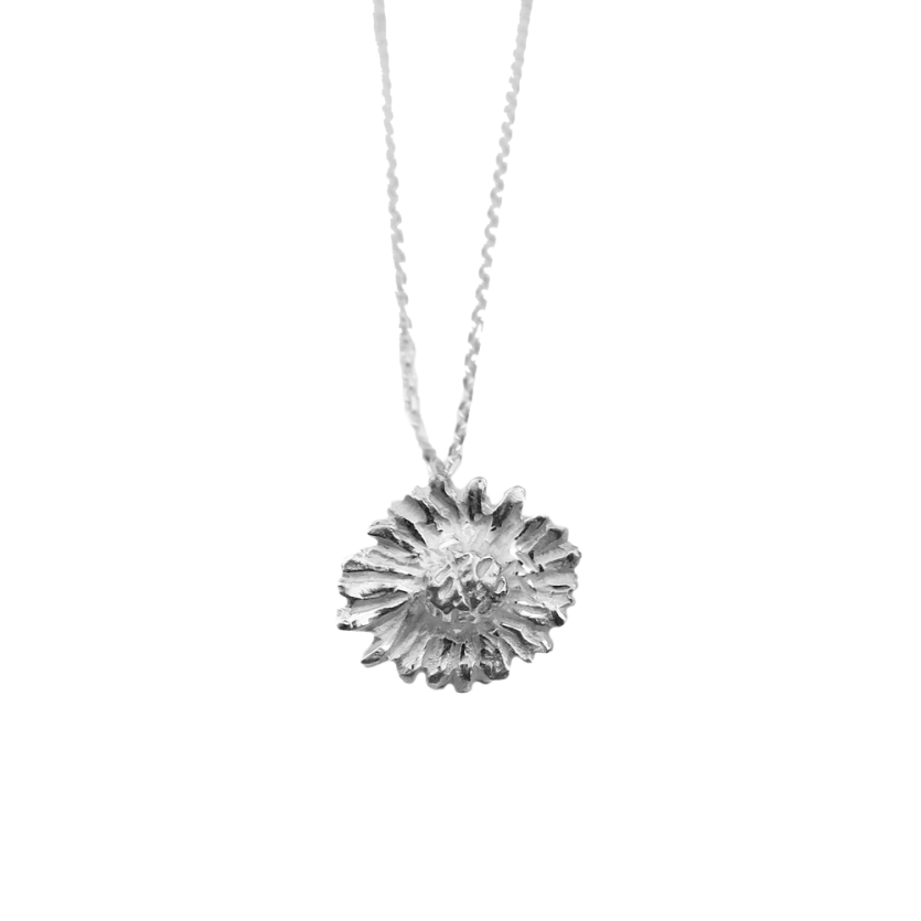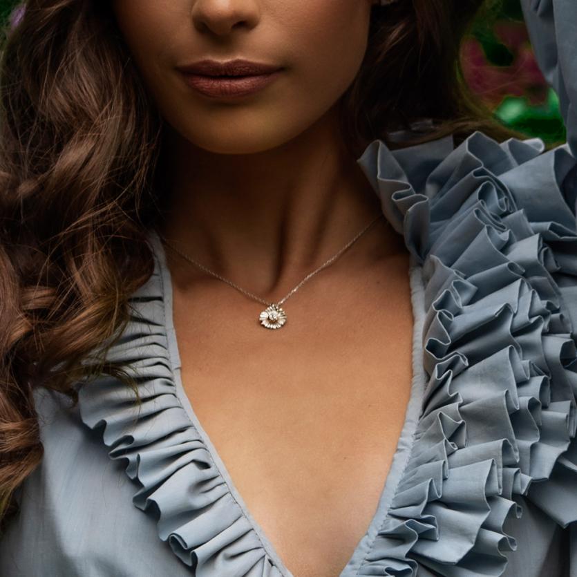 Delikatna ogrlica v obliki marjetice je čudovit detajl k vsakodnevni opravi. Za igriv videz jo kombinirajte z različno dolgimi verižicami.