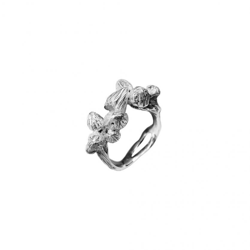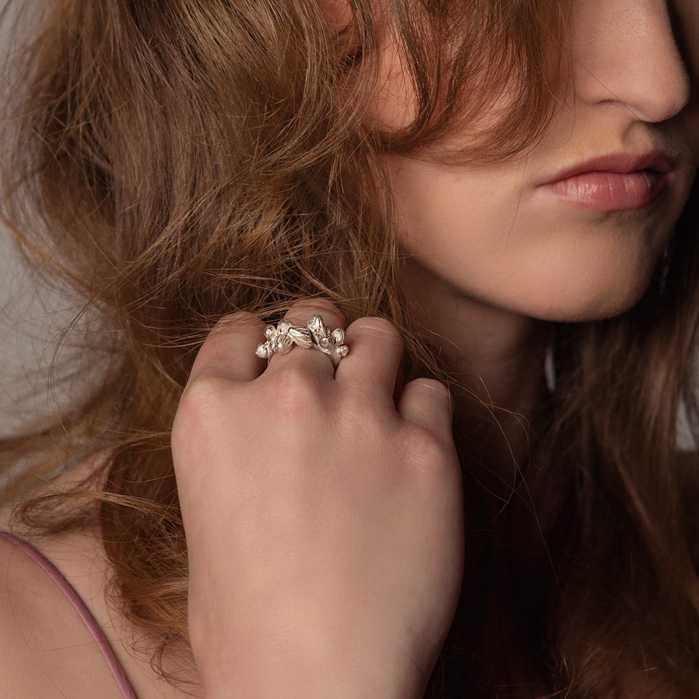 Ljubek srebrn prstan z motivom prepletajočih se gobic vas popelje v pravljični svet gozdnih skrivnosti.