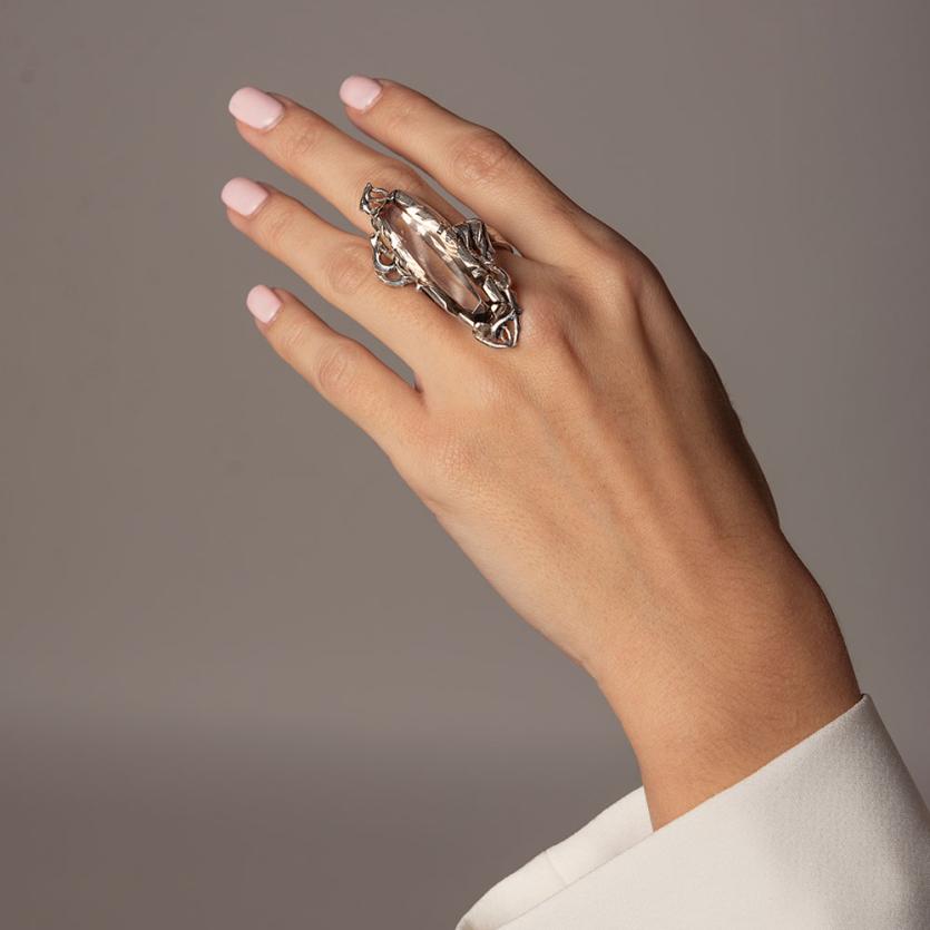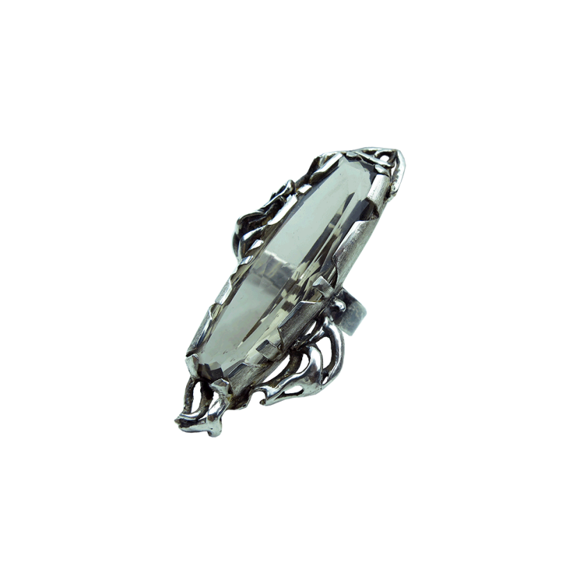 Prstan, ki odseva mistično globino narave. V središču kraljuje velik podolgovat dimni kremen, kamen ozemljitve in notranje moči, ki s svojo globoko barvo spominja na meglice starodavnih gozdov. Okoli njega se vije zapletena koreninska struktura, ki simbolizira povezanost, rast in skrivnosti zemlje.
