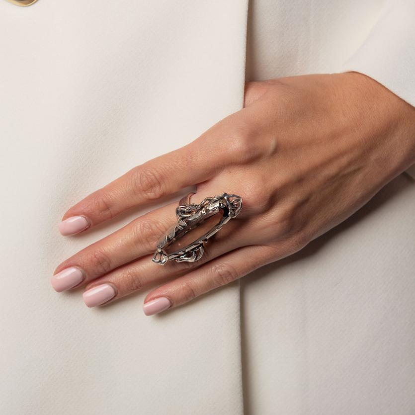 Patinirano srebro se harmonično zlije s temnimi odtenki kamna in ustvari magično organsko celoto. Prstan je mogočen in prekriva dobršen del prsta – drzen kos nakita za tiste, ki jih privlači prvinska moč narave.
