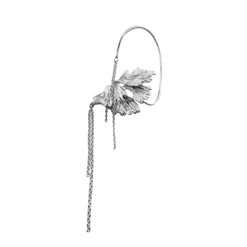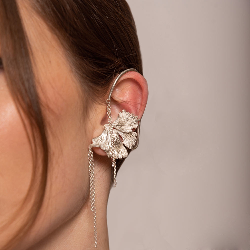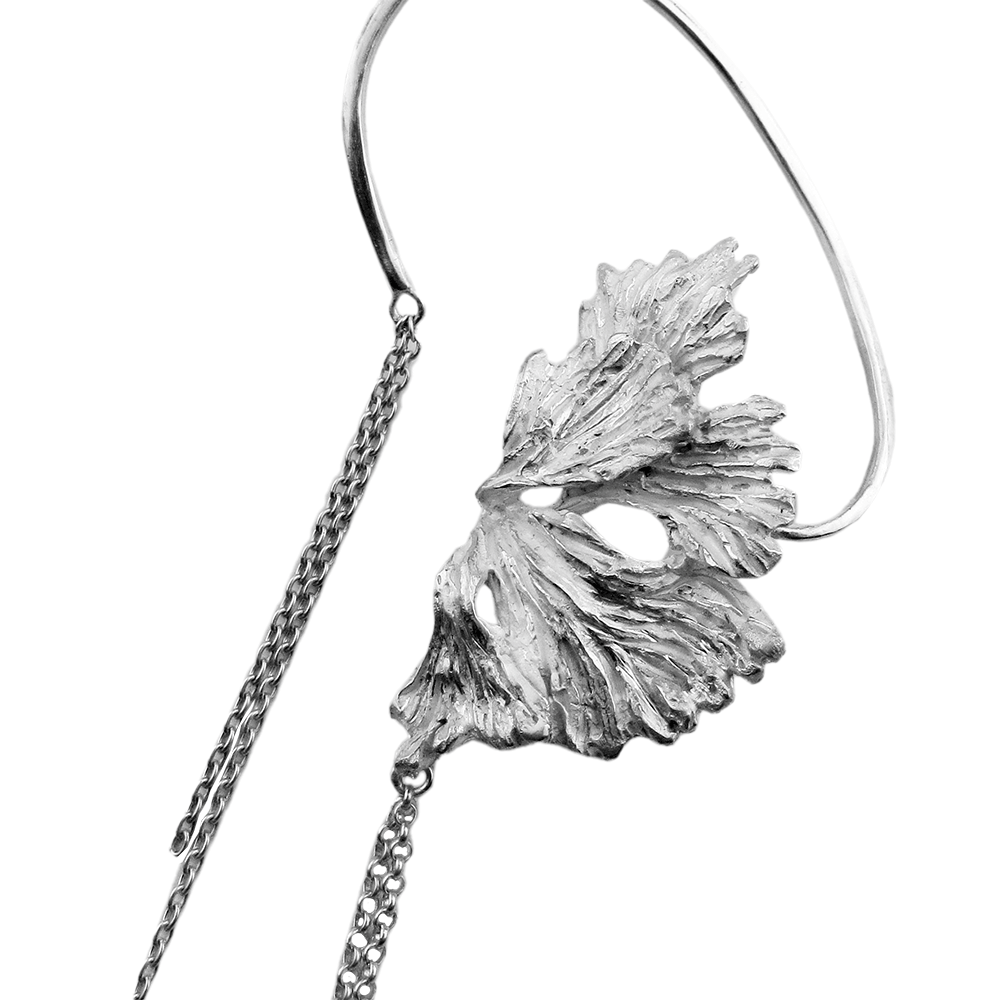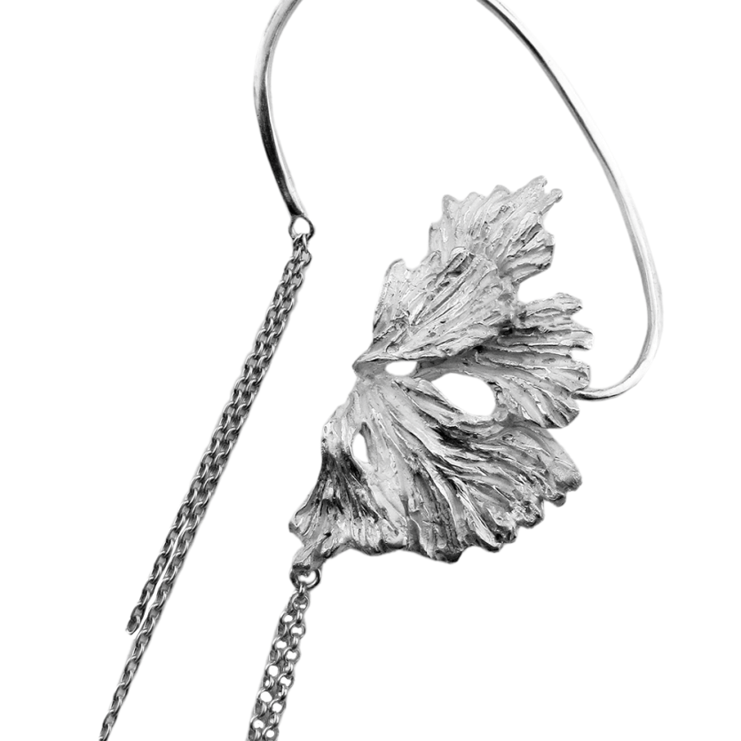 Čaroben uhan združuje prefinjenost in eleganco narave. Ovija se okoli ušesa v obliki čudovite gozdne gobe, ki se razteza v cvetoče oblike srebrnih detajlov in vašemu videzu dodaja kanček glamurja.
