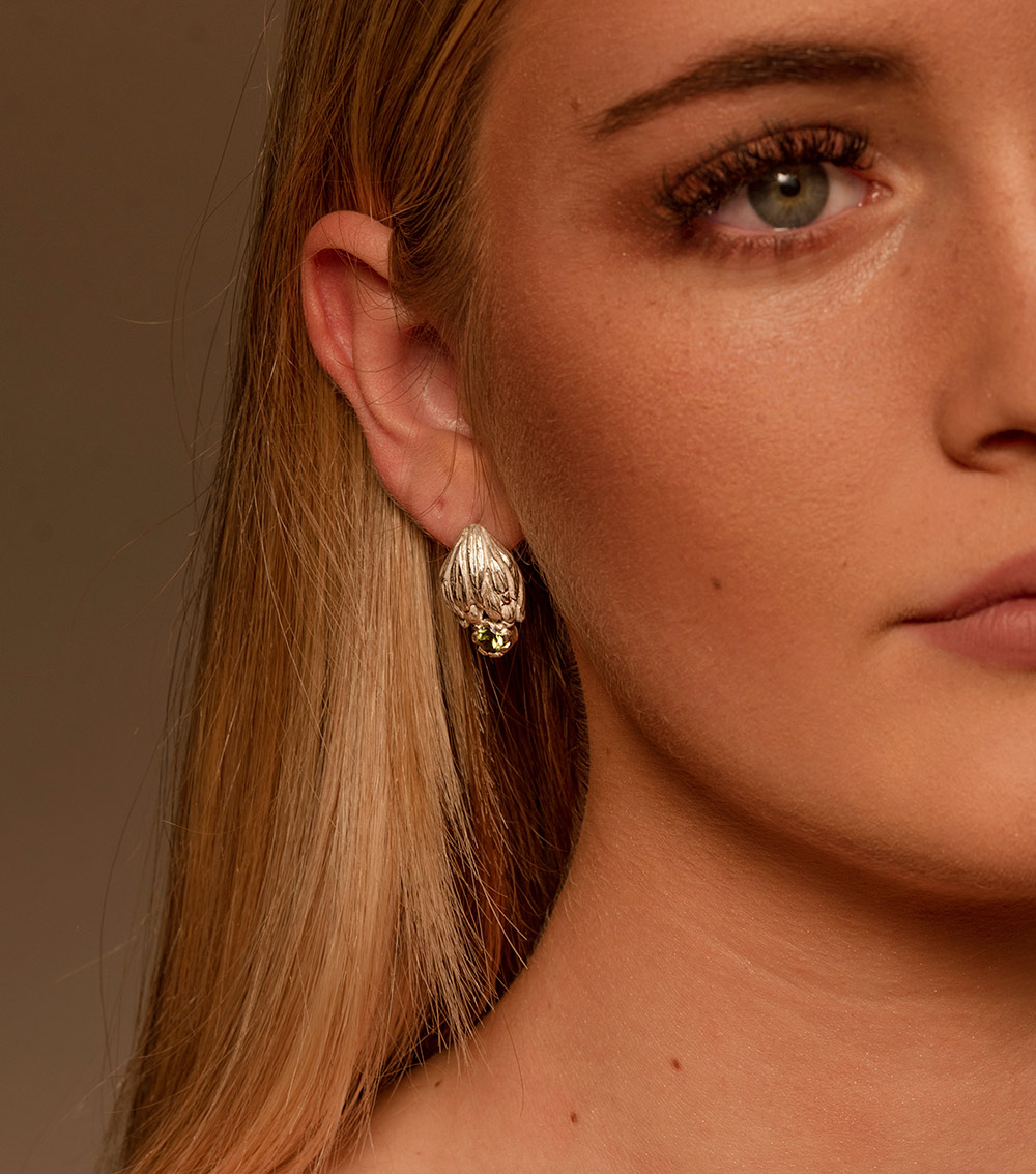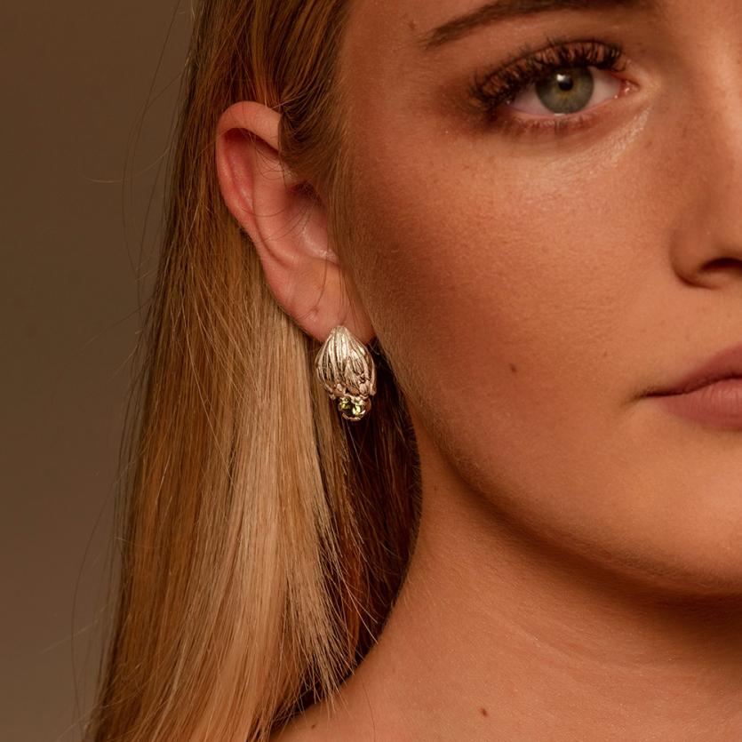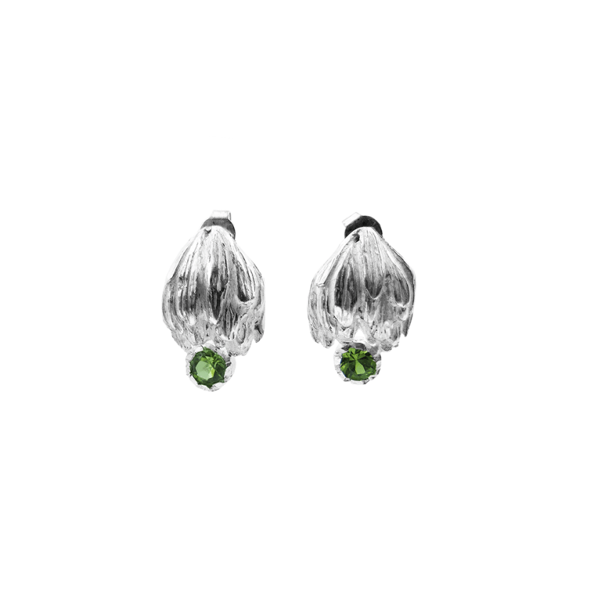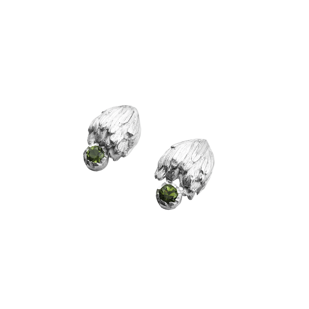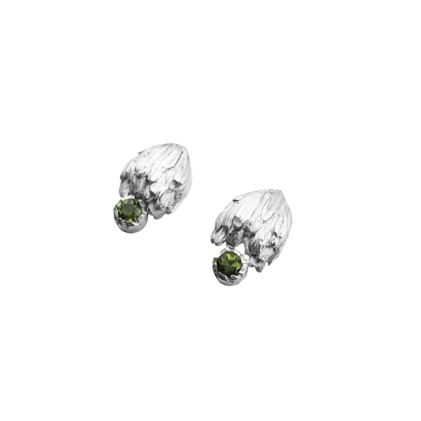 Ljubki srebrni uhani v obliki cvetov artičoke z bleščečim zelenim turmalinom.