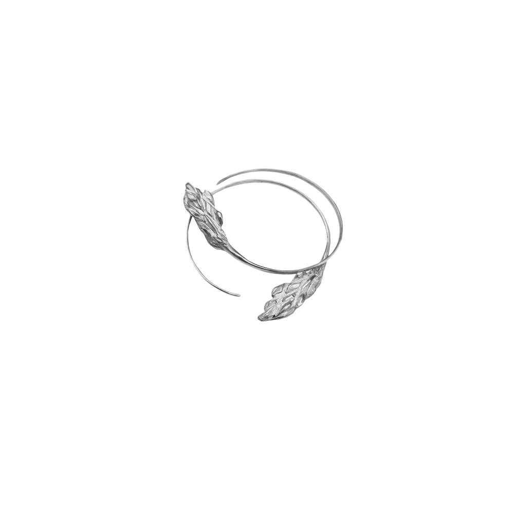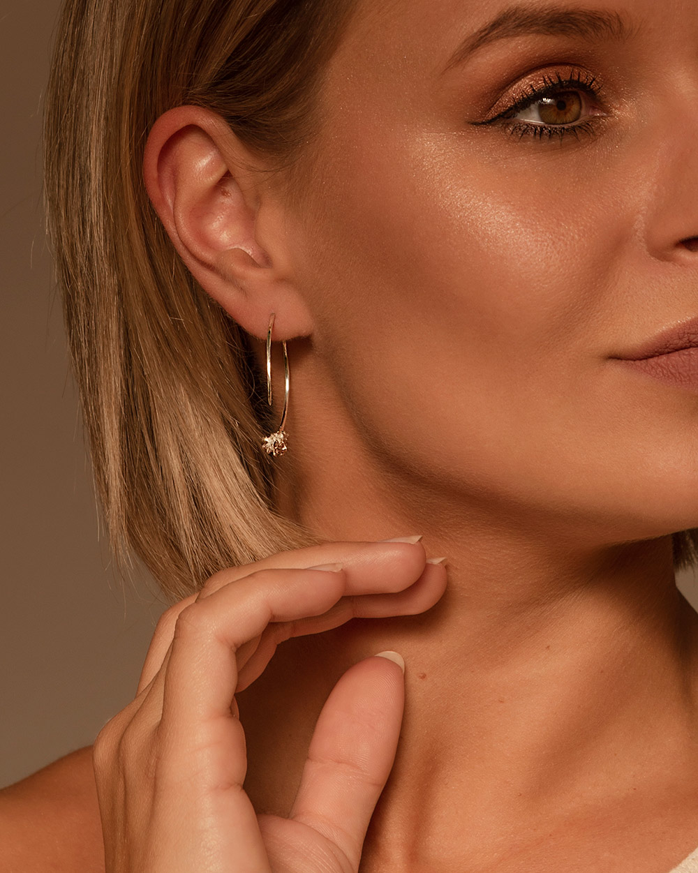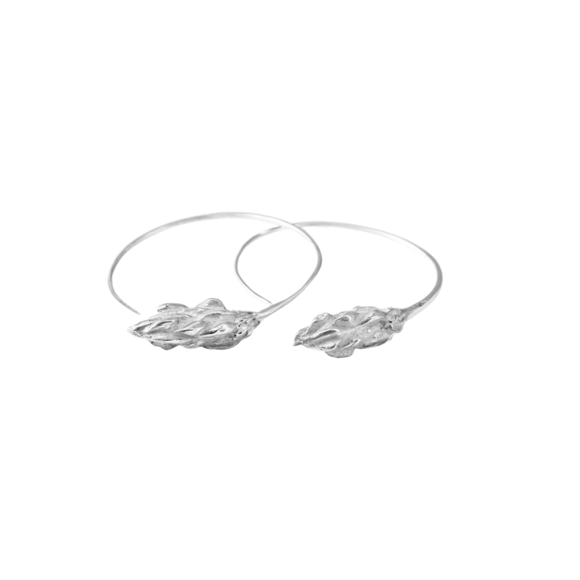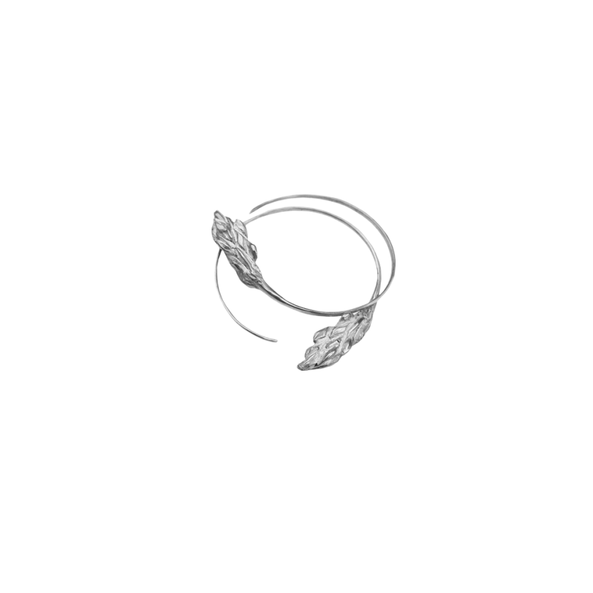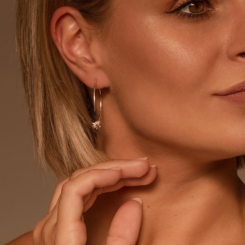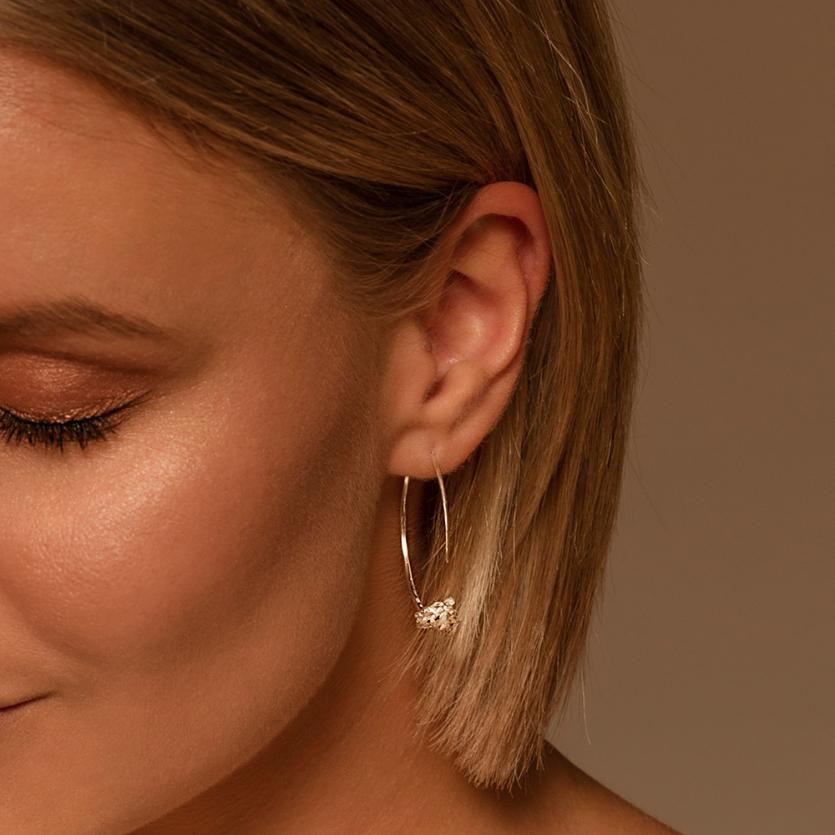 Uhani, ki se lahko nosijo iz obeh smeri, so udobni, eleganti in lahki. Motiv cveta glicinije se nadaljuje v elegantno krožno obliko.