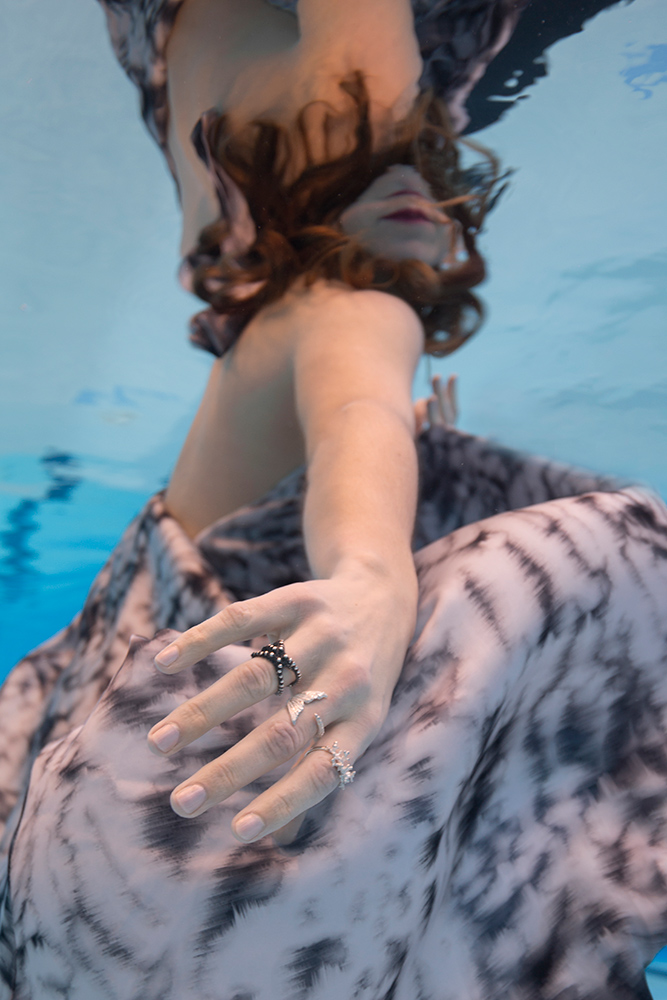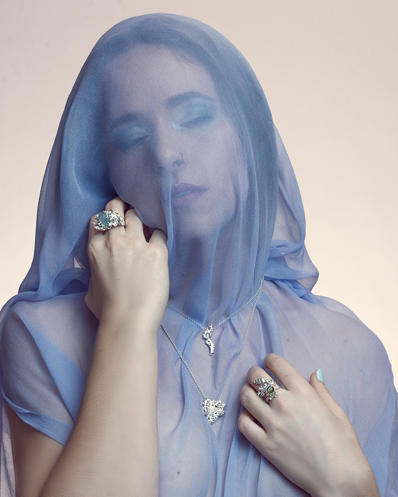Pri kolekciji 'Morsko življenje' se vse vrti okoli organskih koralnih oblik in prebivalcev morskih globin. Prstani dajejo vtis, kot da so iztrgani iz samega osrčja koralnega grebena; ogrlice in uhani na vašem telesu valovijo nežno kot v objemu morskega toka. Kolekcija je namenjena posameznikom, ki ljubijo skrivnosti morskih globin in si ob sebi vedno želijo imeti delček morja.